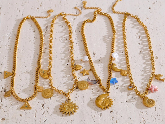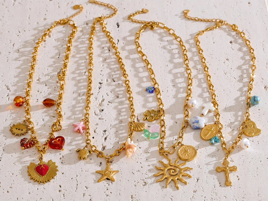 From everyday chains to statement collars and Y-chains. Versatile lengths and motifs including hearts, stars, crosses, and ocean icons.