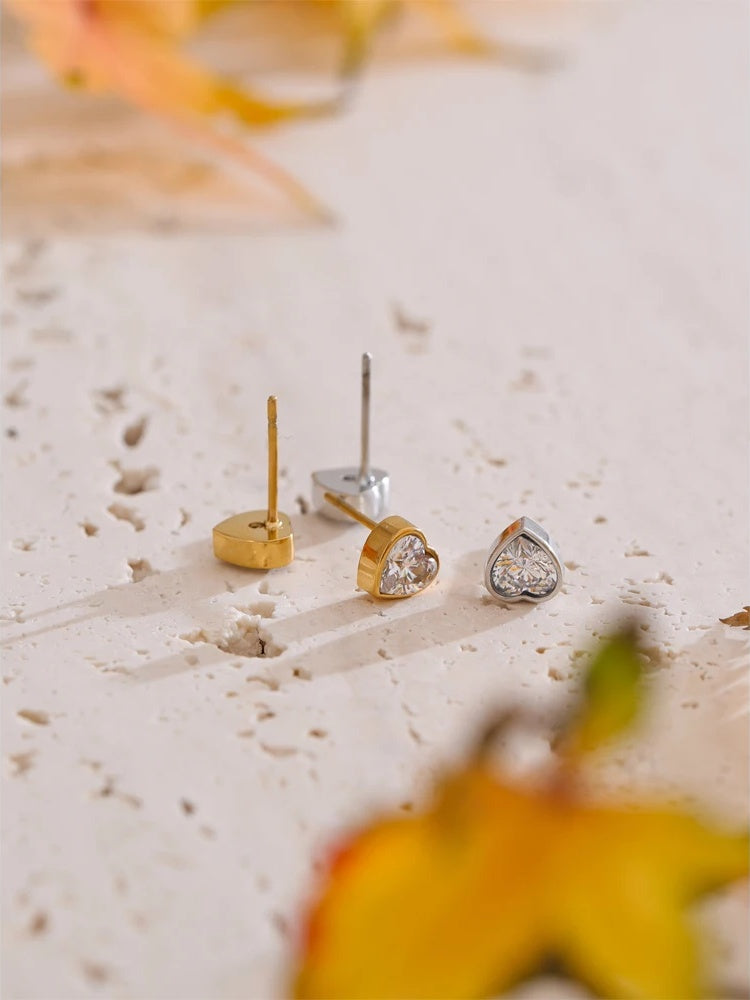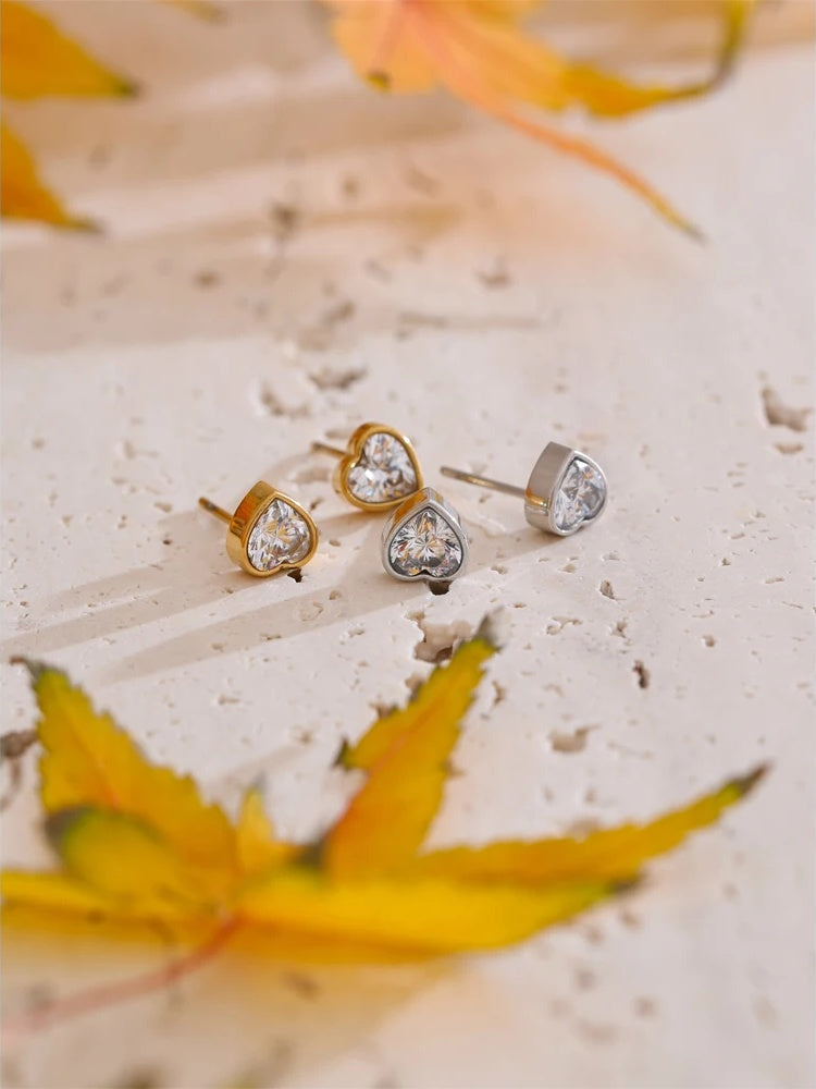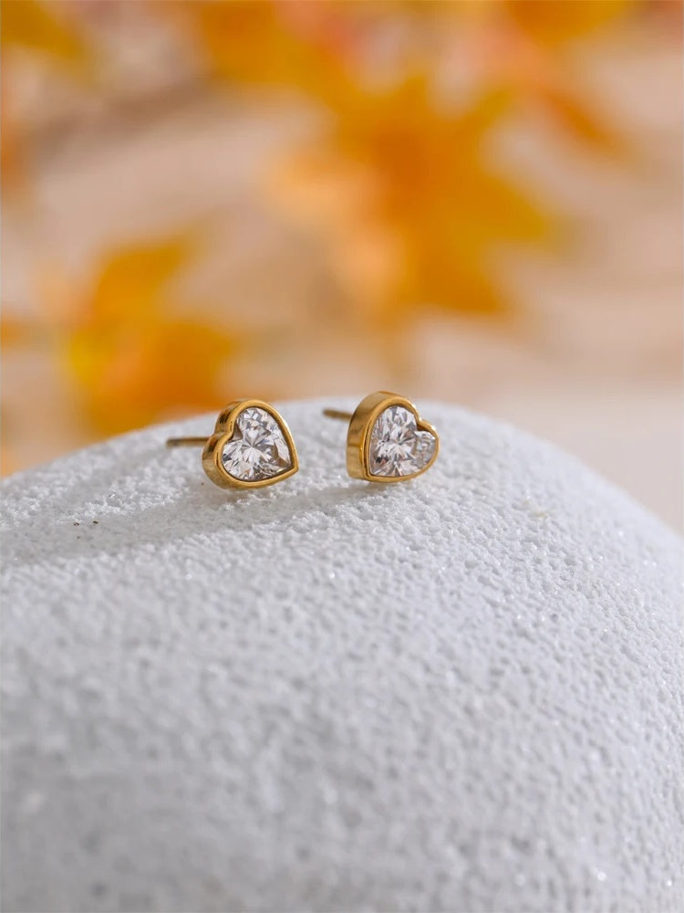 Heart-shaped stud earrings featuring high-quality cubic zirconia stones set in durable stainless steel with a polished gold or platinum finish. These earrings use a secure push-back closure for comfortable daily wear. Designed with a trendy yet delicate style, they offer a sparkling, elegant look perfect for any occasion.