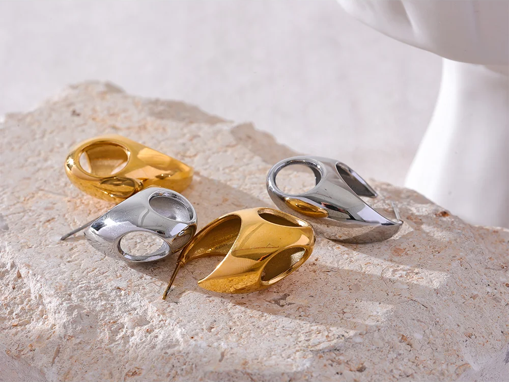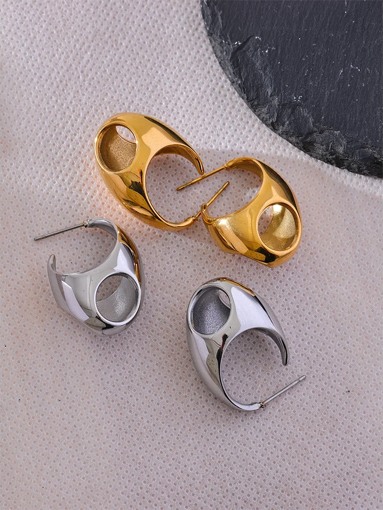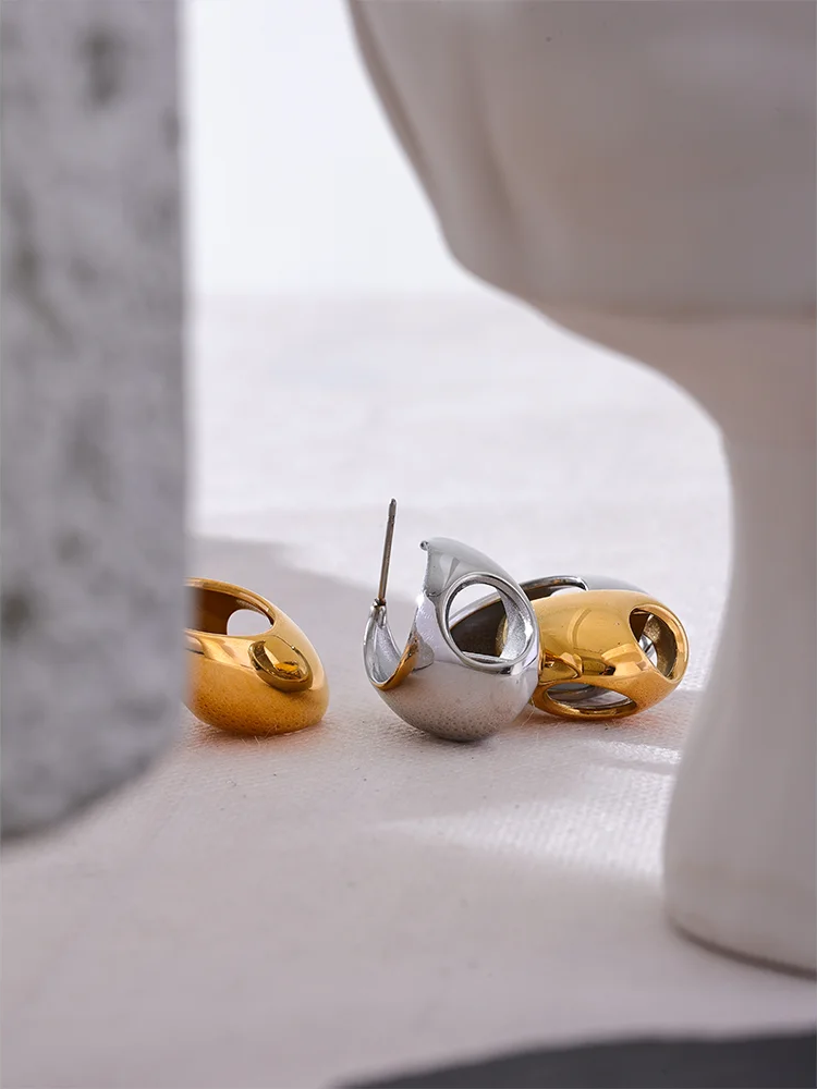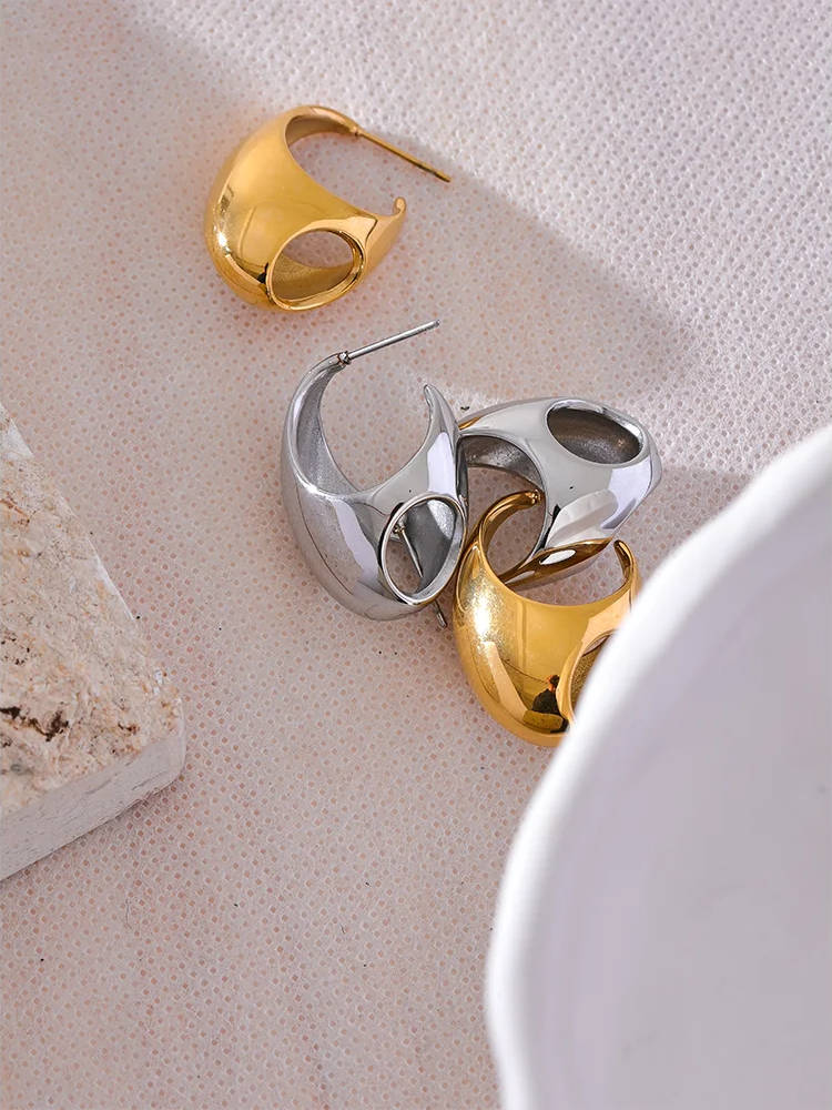 Crafted from polished stainless steel with a PVD real gold plating, these hoop earrings feature a unique geometric hollow design that offers a modern, minimalist look. The smooth, glossy finish enhances their sleek silhouette, while the huggie style ensures a comfortable, secure fit. Waterproof and durable, they are designed to maintain their shine and resist tarnishing over time. Ideal for everyday wear or special occasions, these earrings add a subtle yet distinctive accent to any outfit.