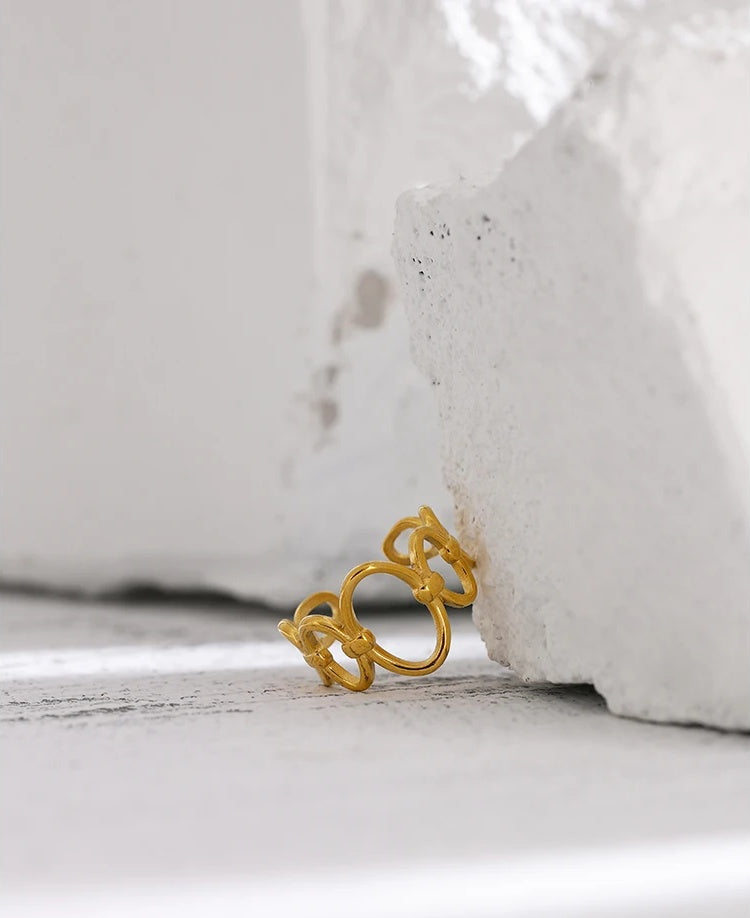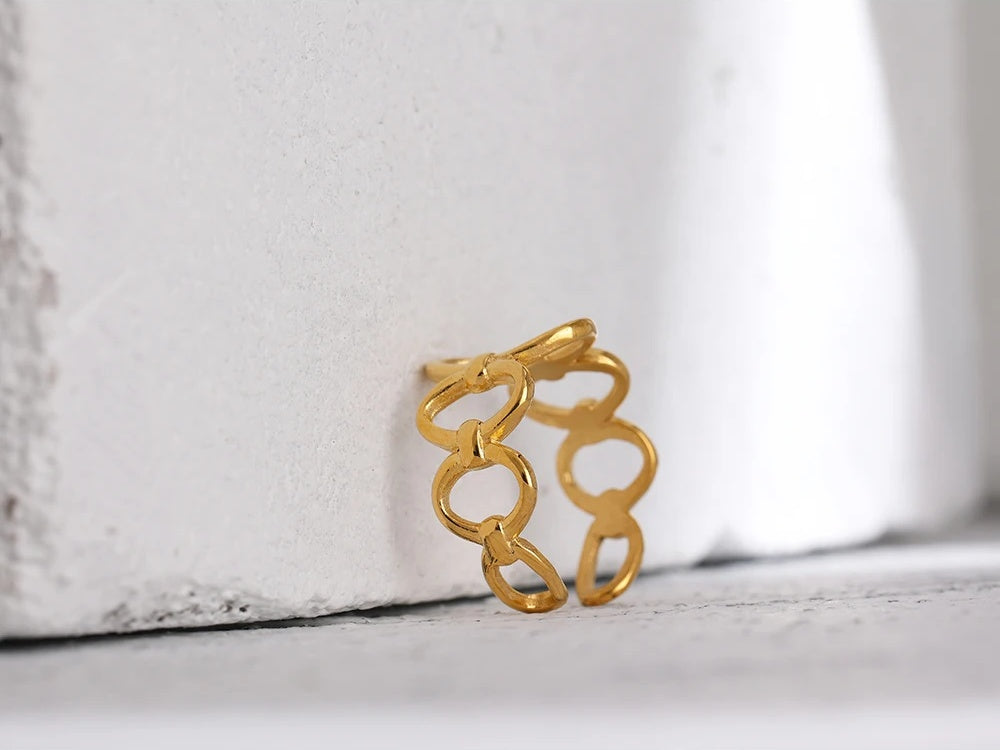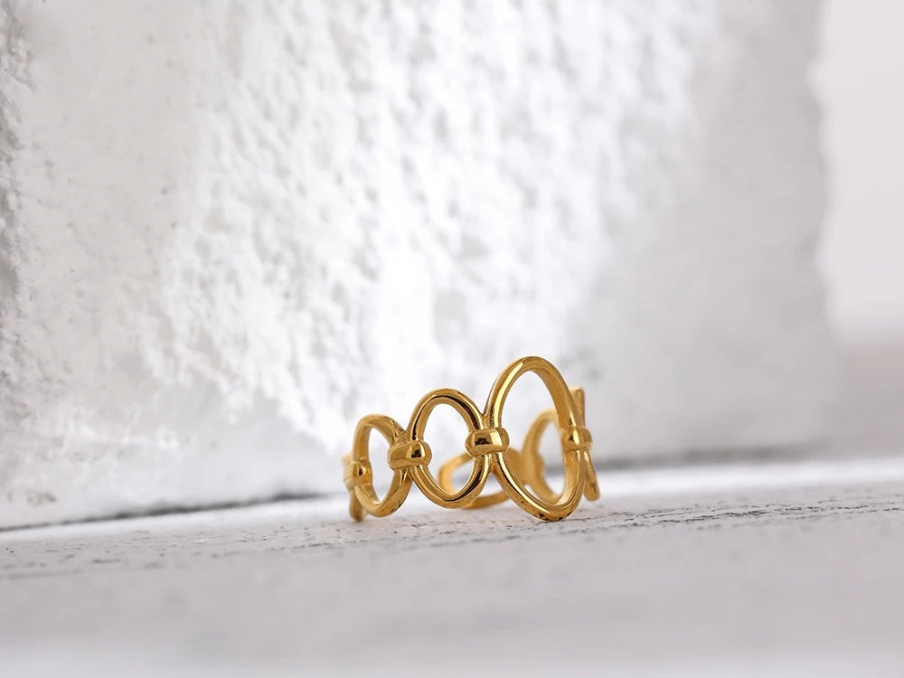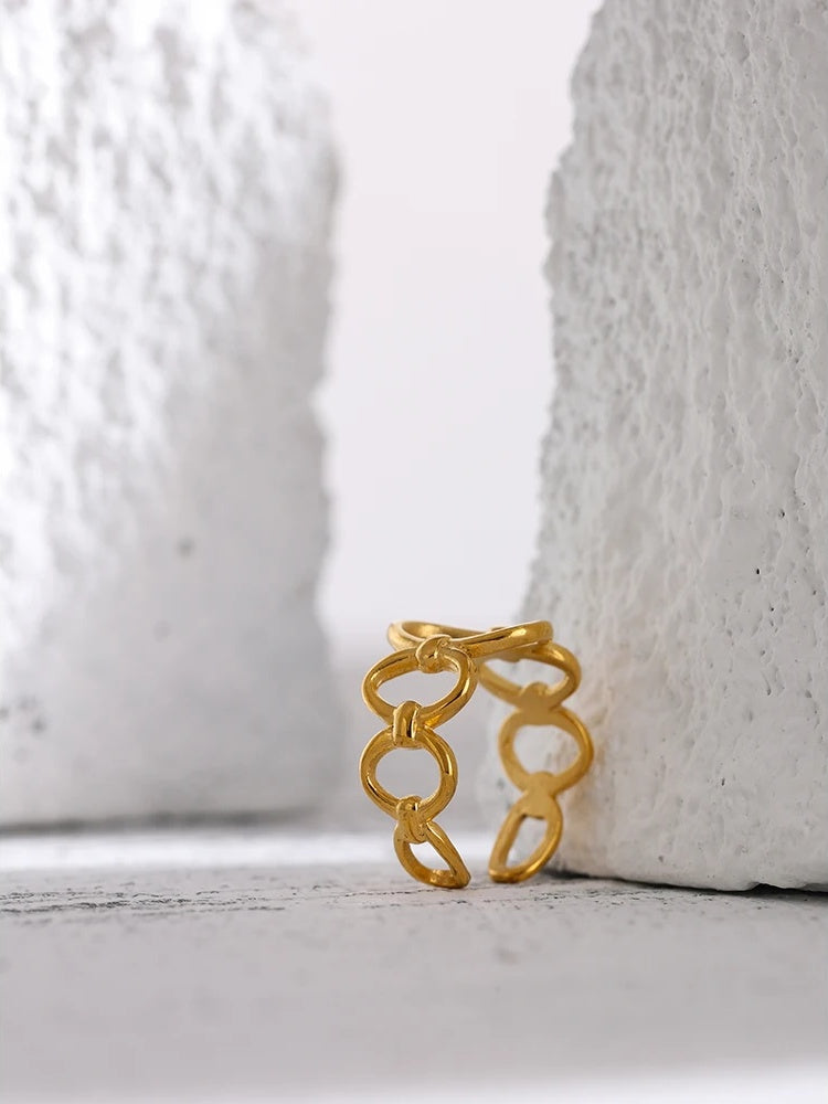 Crafted from durable stainless steel and finished with 18k gold plating, this open chain ring features a trendy geometric design that stands out. Its adjustable opening ensures a comfortable fit, making it suitable for various finger sizes. Perfect for parties and special occasions, the lightweight metal construction offers both style and lasting wear. The ring's unique linked circles create a fashionable statement piece that complements any outfit.