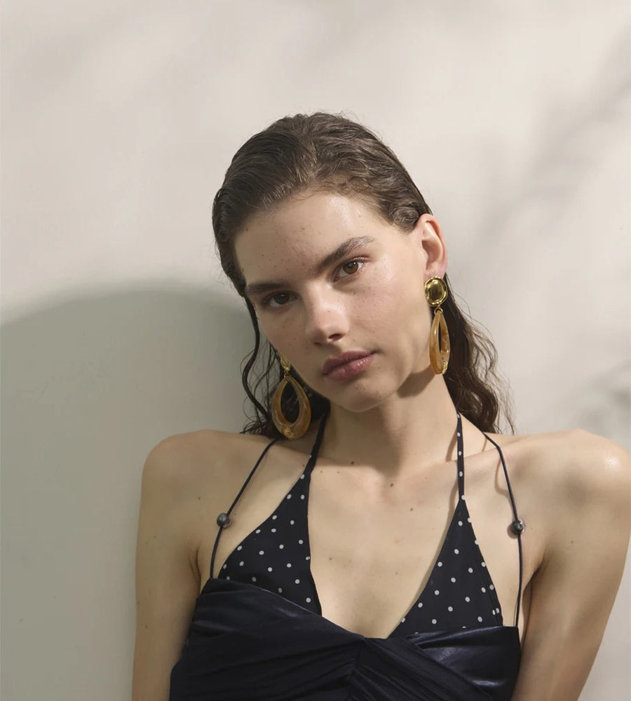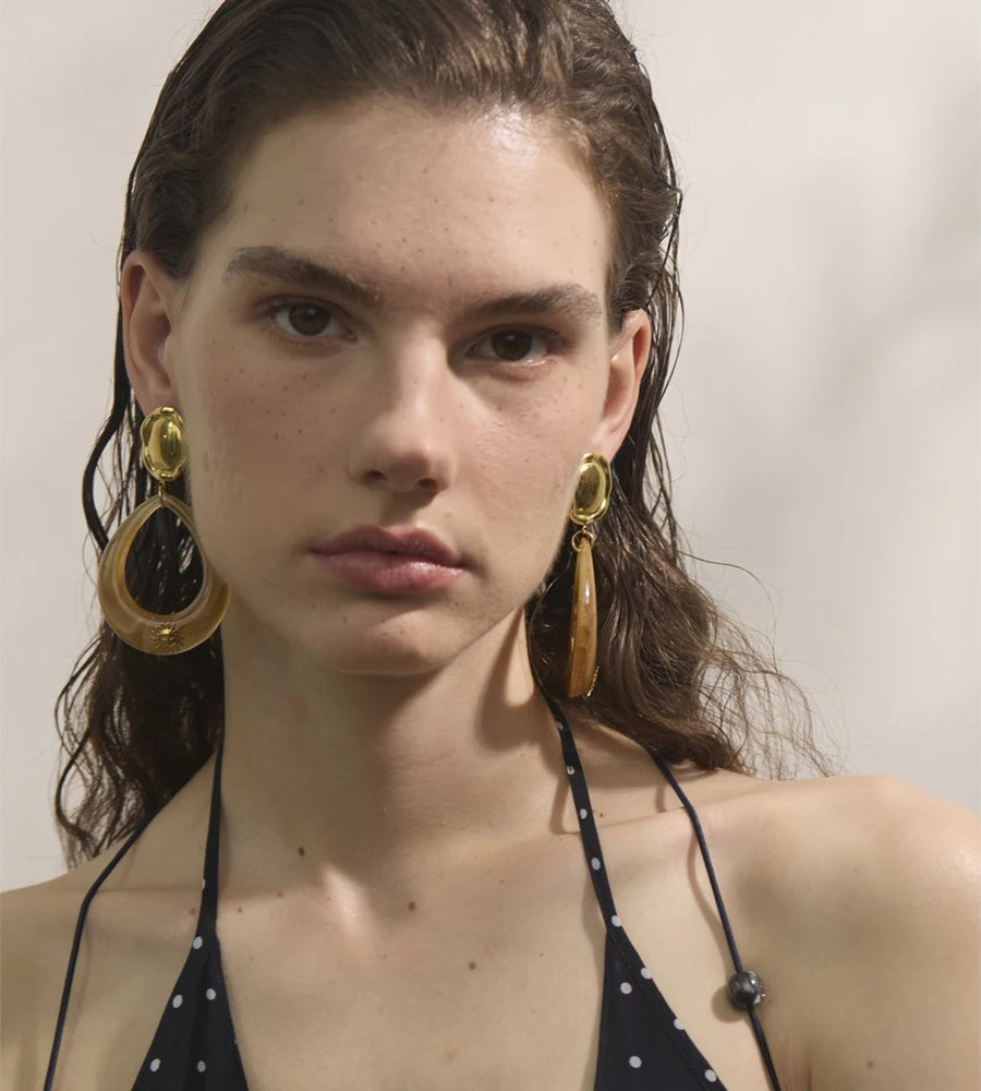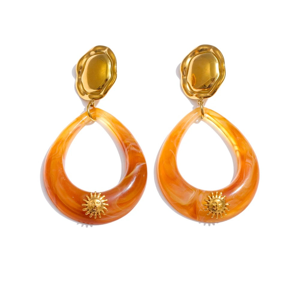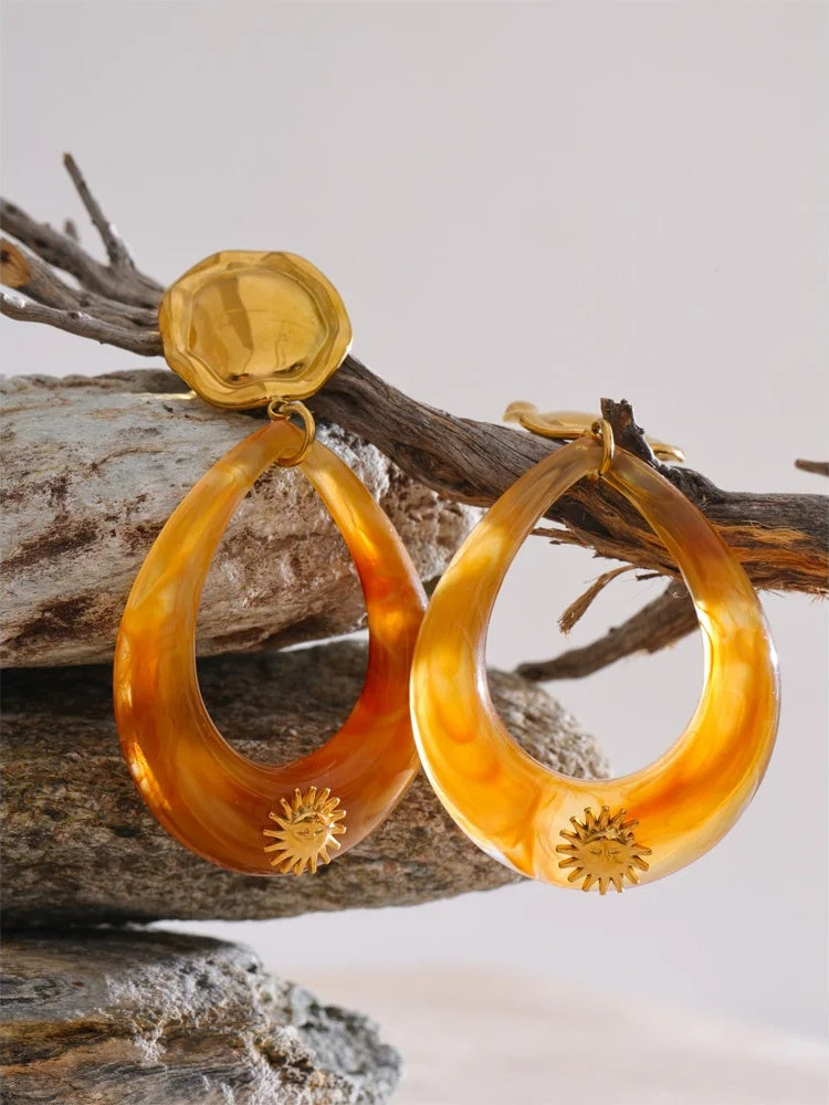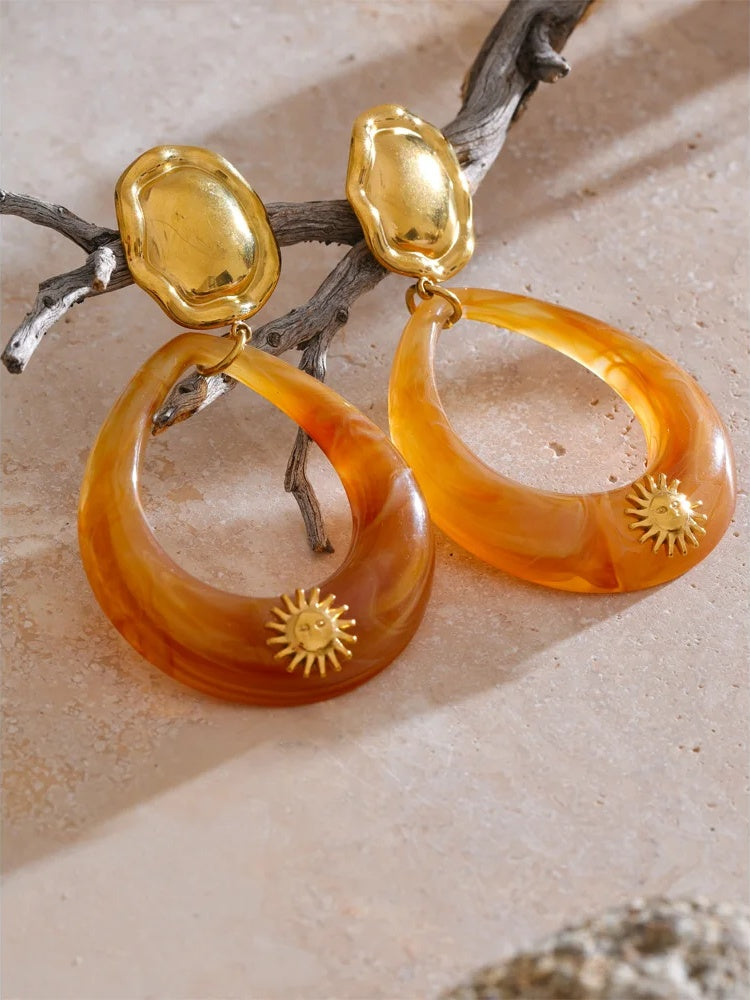 These dangle earrings feature a unique water drop shape crafted from lightweight acrylic resin with a warm, marbled amber hue. The top part is a textured, irregular gold-tone stainless steel piece that adds a modern touch. Each earring is adorned with a small sun motif, enhancing its artistic and trendy style. PVD real gold plating ensures durability and a polished finish, making these a fashionable statement accessory.