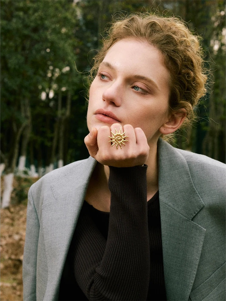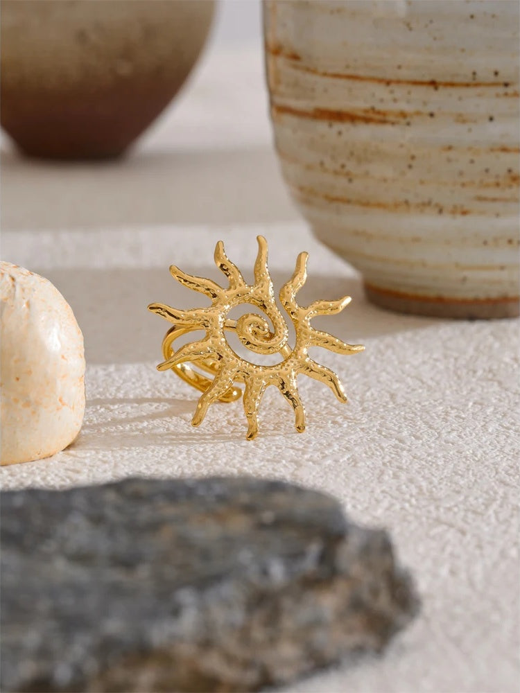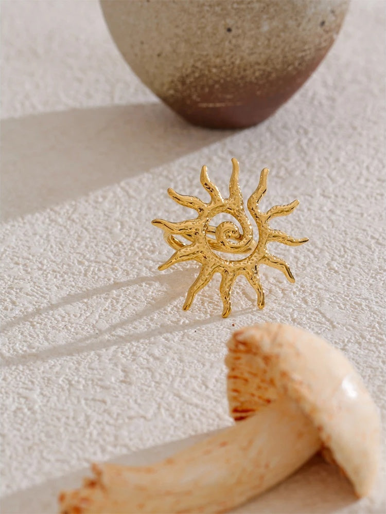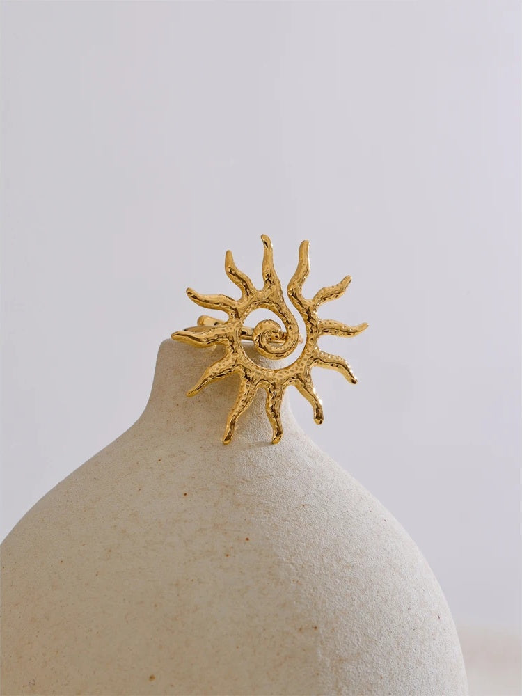 Featuring an abstract sun design, this adjustable ring offers a bold and artistic statement for any occasion. Crafted from stainless steel with 18K gold color plating, it combines durability with a polished, high-quality finish. The resizable band ensures a comfortable fit for daily wear, making it a versatile addition to any jewelry collection. Ideal for parties and trendy looks, this piece adds a unique geometric flair to your finger.