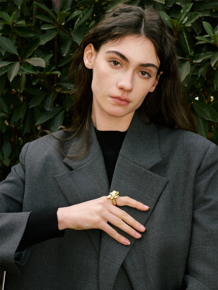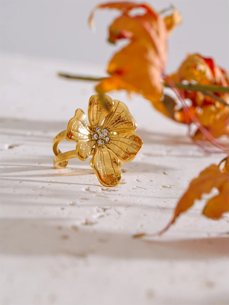 An adjustable ring crafted with stainless steel and coated in 18k gold plating offers a stylish floral design. Clear rhinestones accentuate the center, adding a subtle sparkle to the bold flower shape. Its resizable band ensures a comfortable fit for various finger sizes, making it a versatile accessory for parties and everyday wear. The trendy design combines durability with eye-catching elegance.
