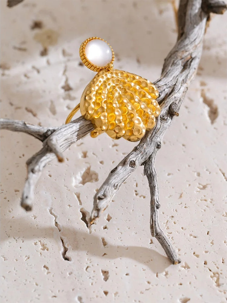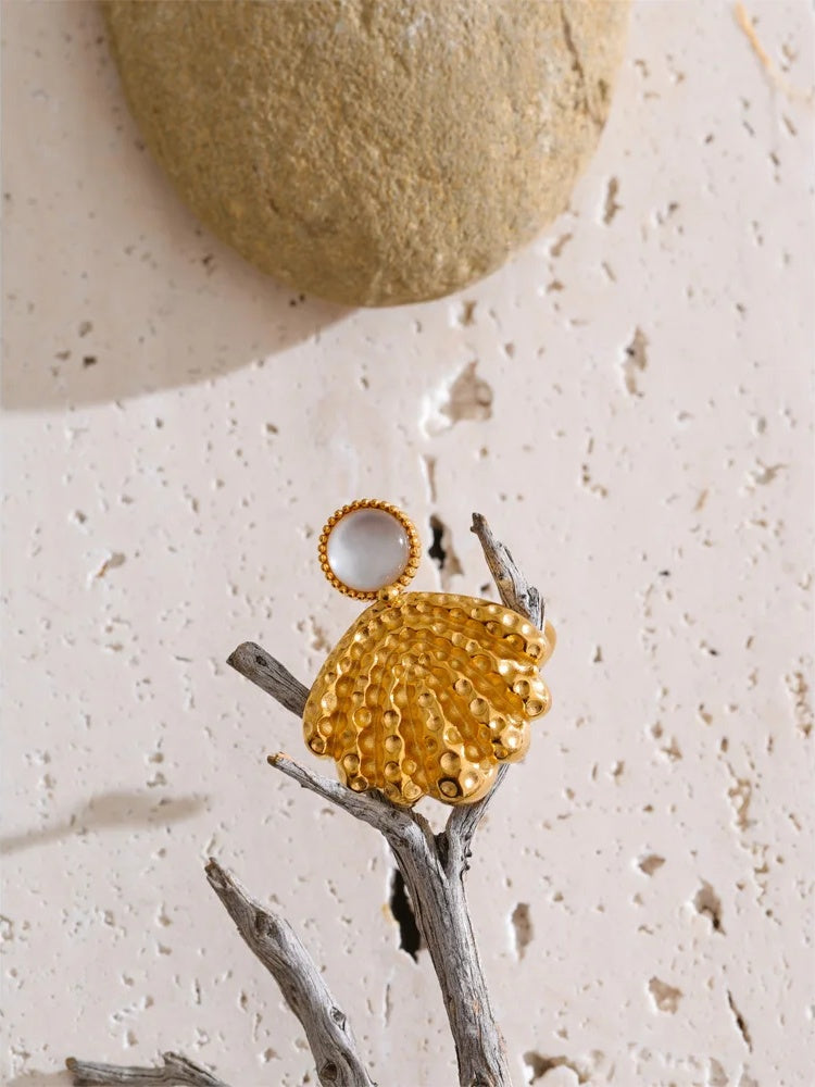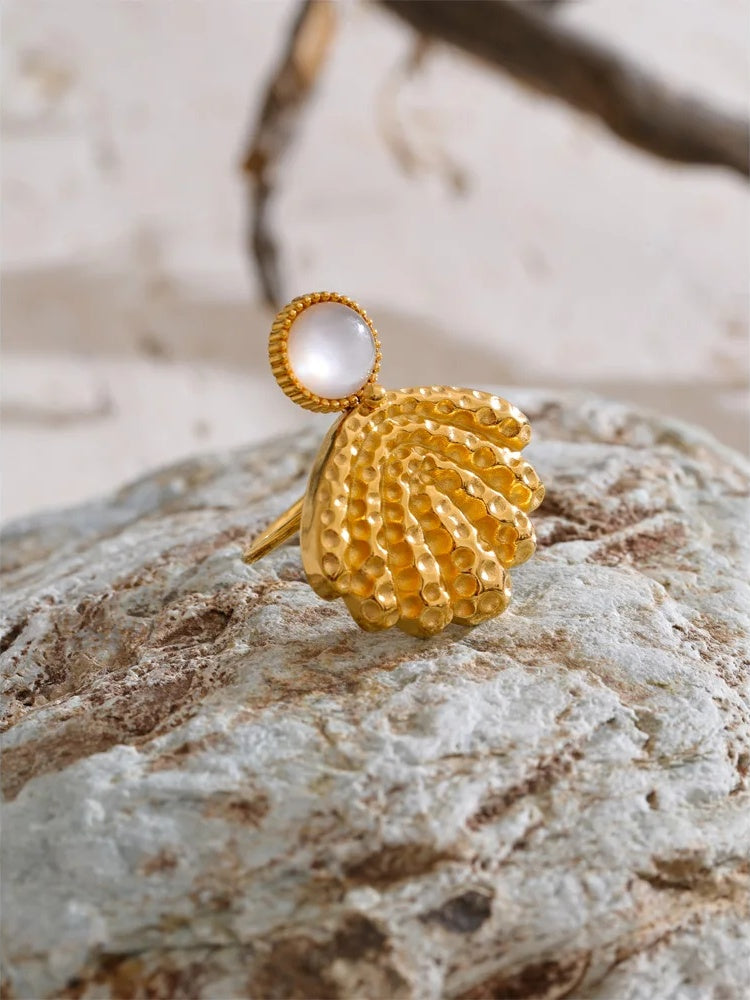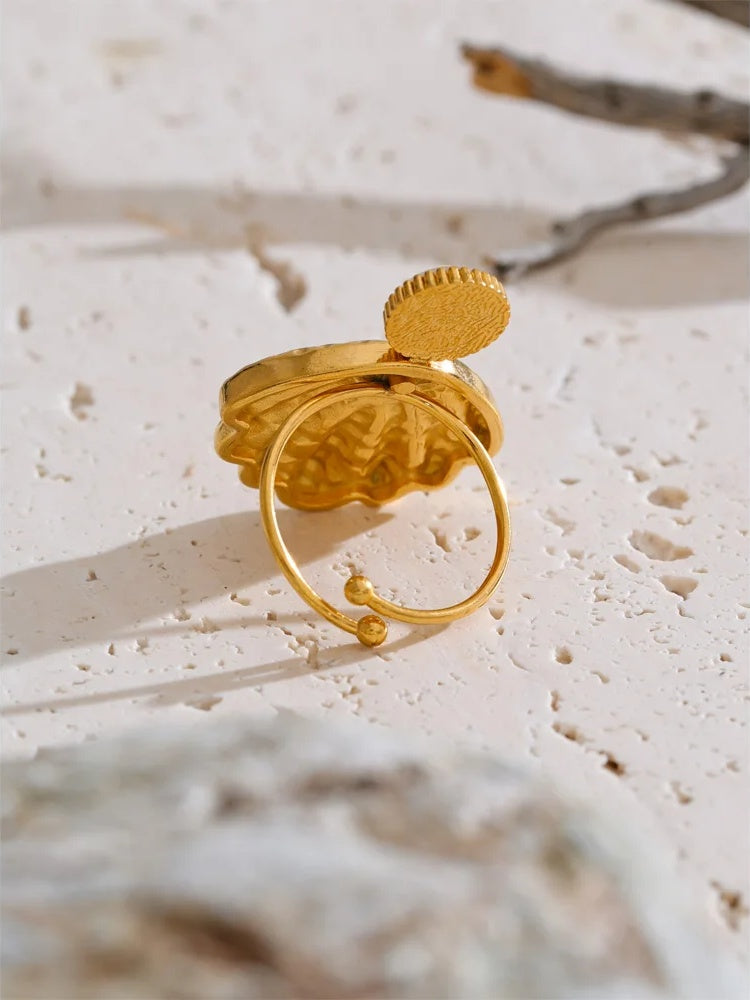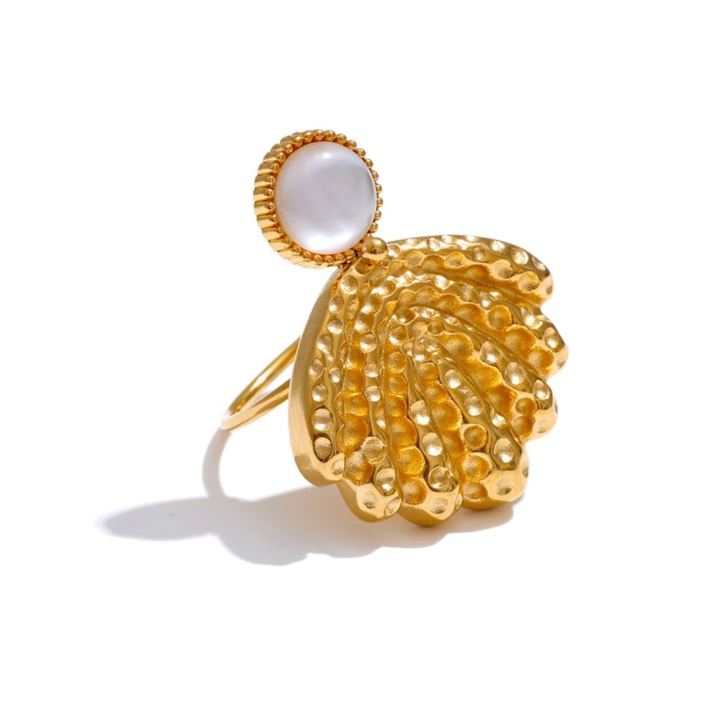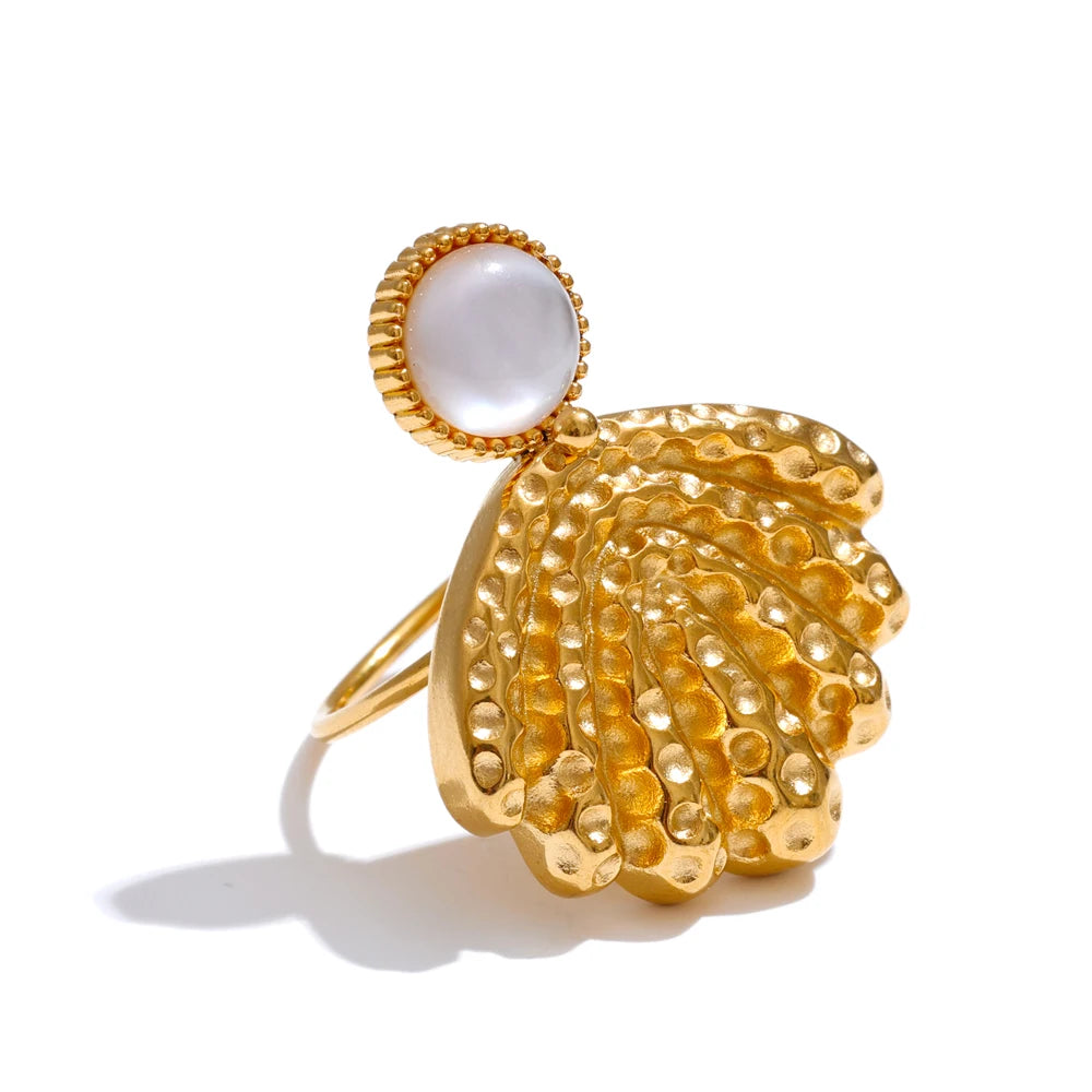 Crafted from stainless steel with 18K gold plating, this adjustable ring features a unique geometric shell design accented by a lustrous shell inlay. The hammered texture adds depth and sophistication, while the resizable band ensures a comfortable fit for various finger sizes. Resistant to rust and chemicals, it is designed for durability and lasting wear. Ideal as a fashionable statement piece or a special gift.
