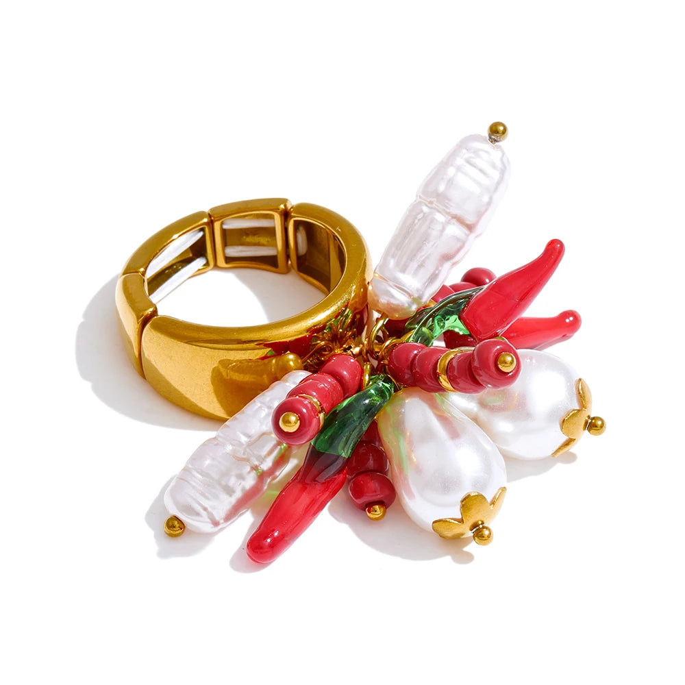 Adjustable in size to ensure a comfortable fit, this ring features a bold cluster of simulated pearls and vibrant chili-shaped charms. Crafted from stainless steel with 18k gold plating, it offers durability with a luxurious finish. The geometric design and elastic charm arrangement add a trendy and eye-catching element, perfect for fashion-forward wearers. Ideal for gifting or personal style, it combines unique detailing with high-quality materials.