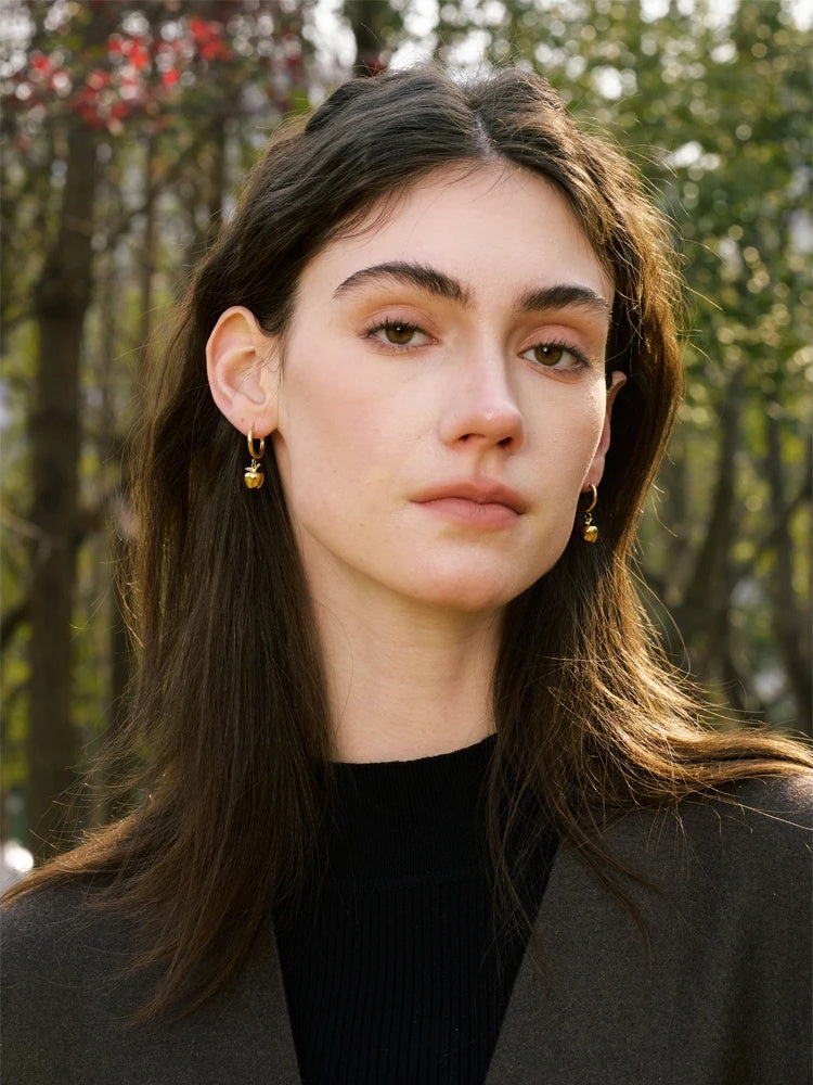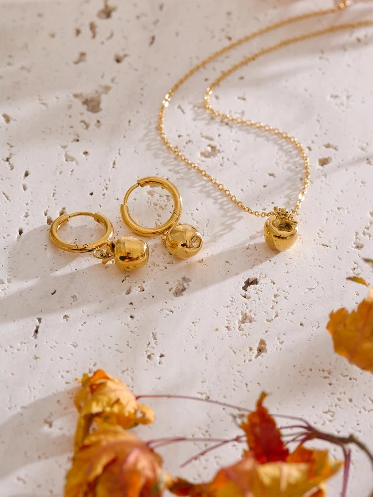 Crafted from stainless steel with a PVD real gold plating, this jewelry set features a delicate apple pendant necklace paired with matching hoop earrings. The design incorporates smooth, polished surfaces and subtle geometric shapes for a modern, trendy look. Resistant to tarnishing, the set is ideal for party wear and everyday elegance. Lightweight and comfortable, it offers a stylish charm accessory that complements various outfits.