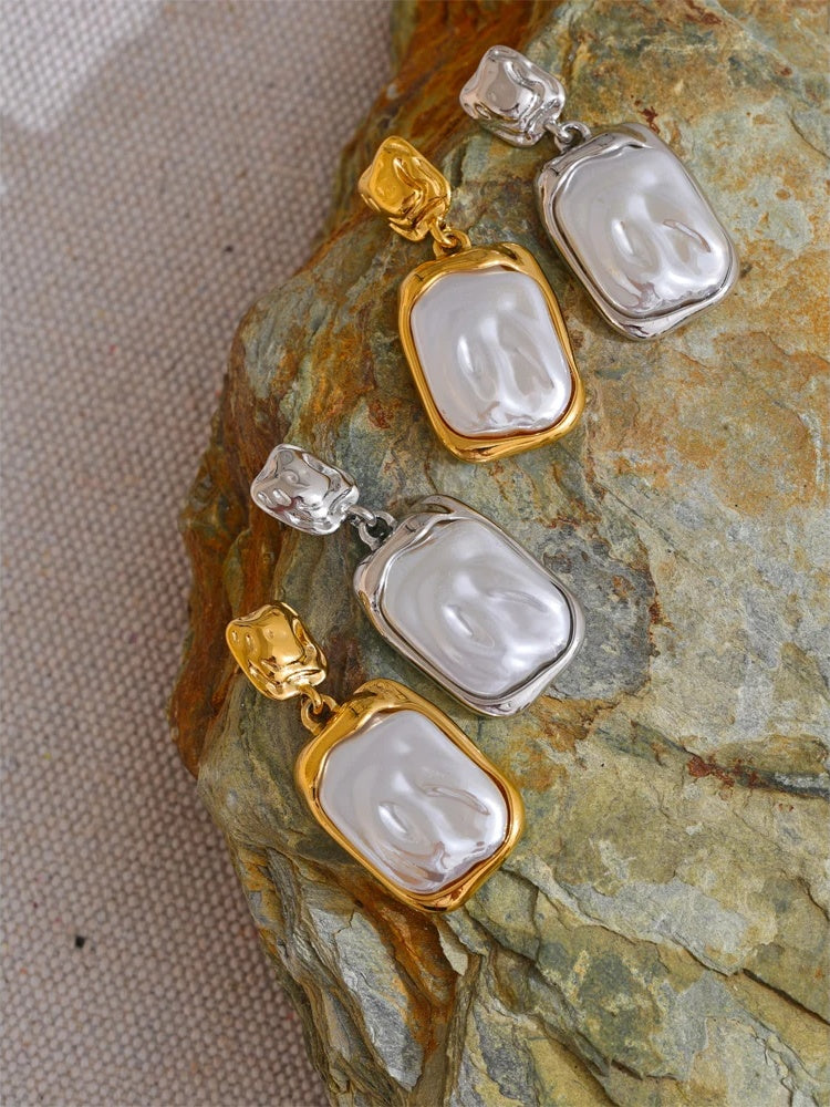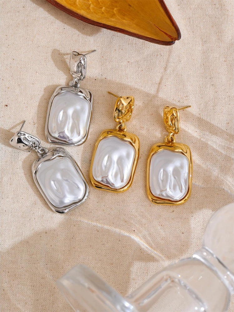 Featuring a unique baroque-inspired design, these drop earrings showcase square-shaped imitation pearls framed in a polished metal setting. Crafted from stainless steel with a PVD real gold-plated finish, they offer durability and tarnish resistance for everyday wear. The geometric pattern and fluid metal accents bring a modern, trendy touch to any outfit. Lightweight and comfortable, these earrings are a versatile accessory suitable for various occasions.