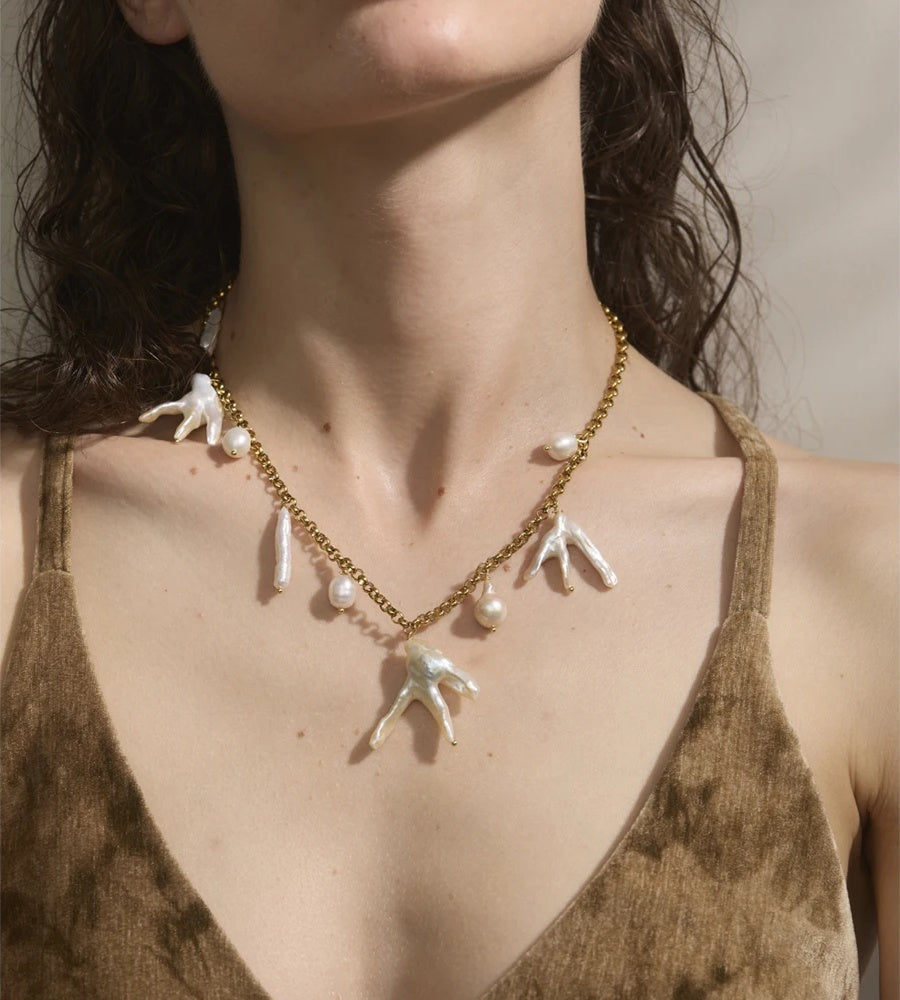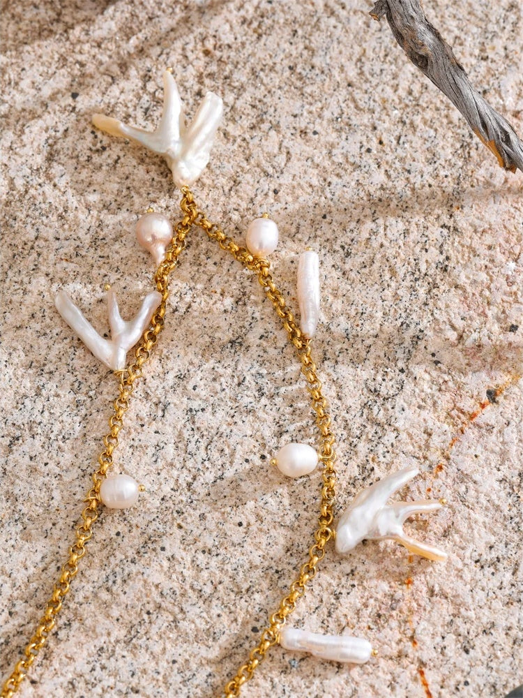 Style it solo for minimal elegance, layer it with delicate chains for a curated look, or pair it with pieces from your collection—think handcrafted hoops, gold-plated earrings, or dainty gemstone jewelry—for elevated everyday styling. This baroque pearl necklace brings a polished glow to tees, blazers, slip dresses, and everything in between.
