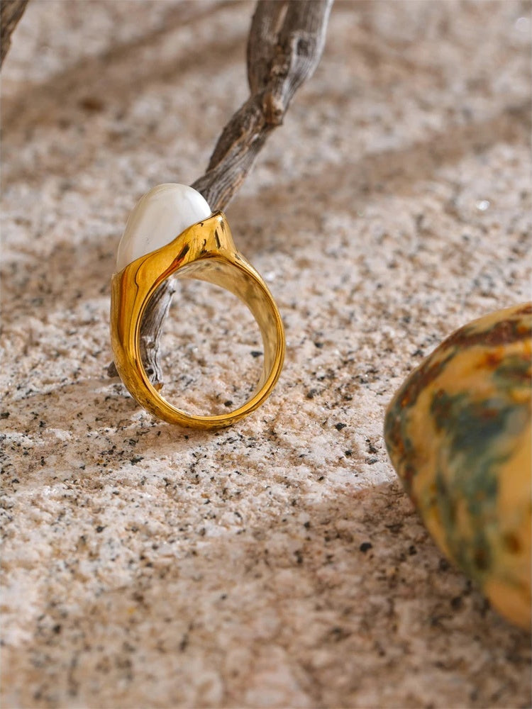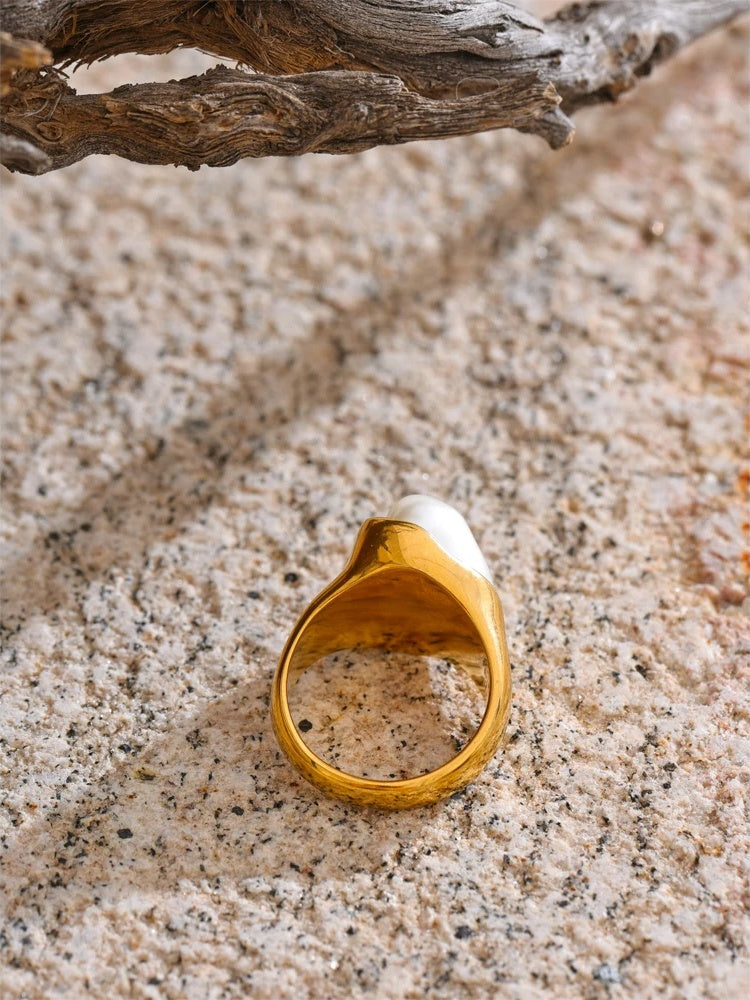 Crafted from stainless steel with a durable 18K gold plating, this ring features a striking baroque-shaped simulated pearl centerpiece. The bold geometric design blends contemporary style with timeless elegance, making it a standout accessory for any outfit. Resistant to high-concern chemicals, it offers lasting wear suitable for everyday use or special occasions.