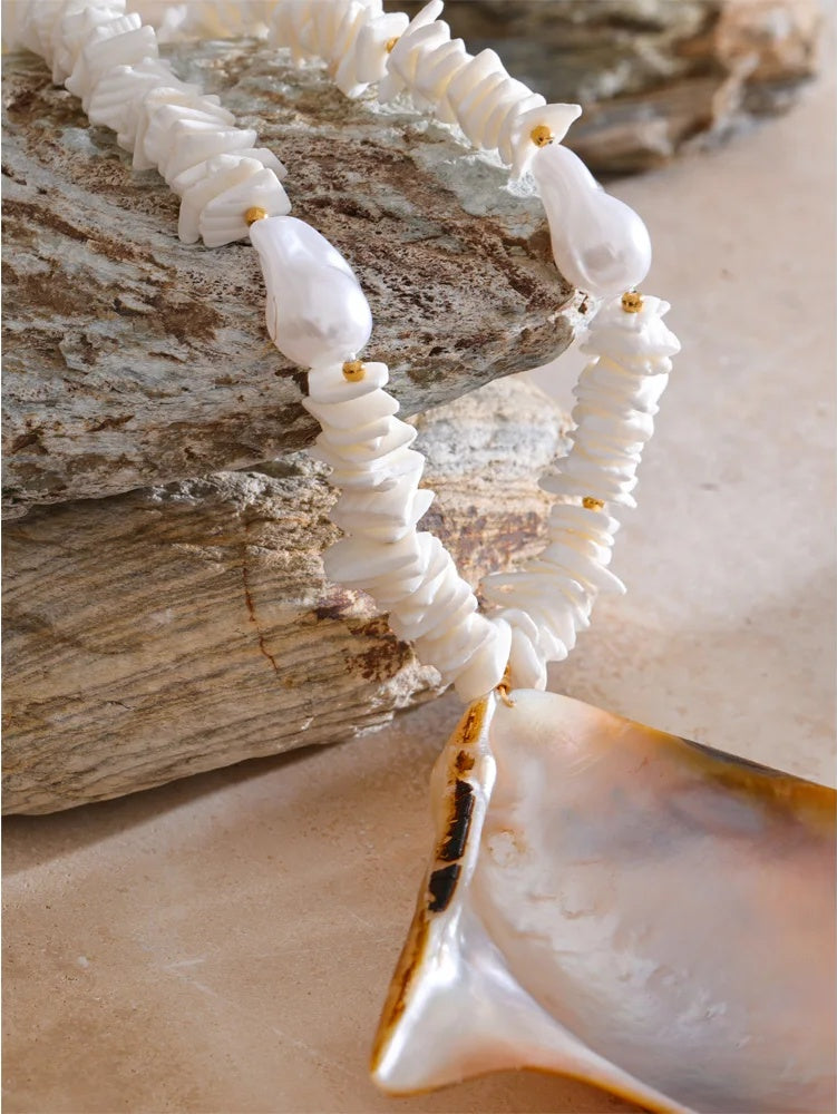 Handcrafted with a large shell pendant and baroque simulated pearls, this necklace offers a unique geometric design perfect for summer and holiday wear. Made from durable stainless steel with a gold-plated finish, it combines fashion-forward style with long-lasting quality. The adjustable chain ensures a comfortable fit for all occasions.