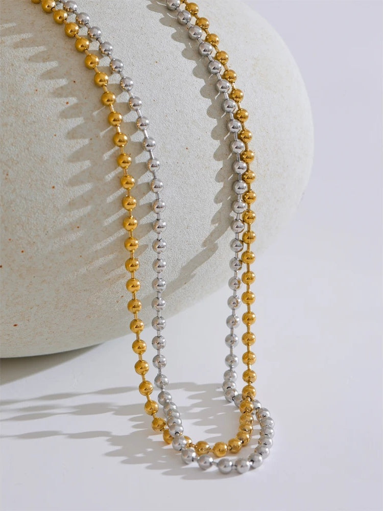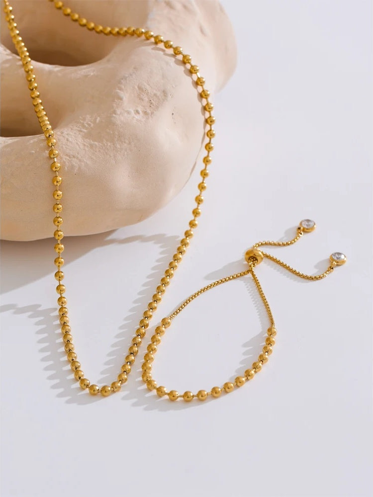 Elevate your every day with a refined necklace-and-bracelet duo designed for modern ease. Crafted from durable stainless steel and finished with PVD real gold plating, this set features a polished beads-chain silhouette accented with geometric details and subtle cubic zirconia sparkle. The result is a clean, contemporary look that transitions effortlessly from desk to dinner.