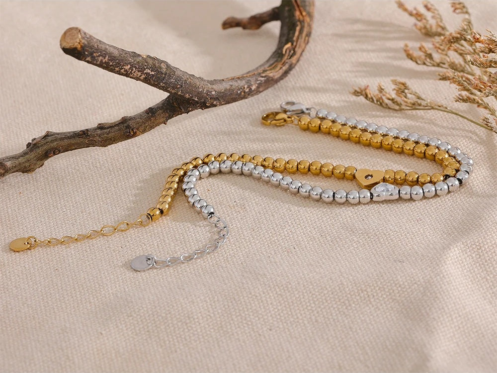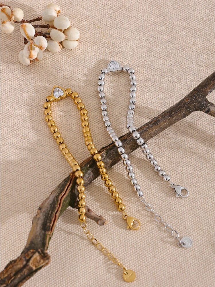 Crafted from durable stainless steel with a polished gold finish, this bracelet features a string of smooth beads accented by a heart-shaped zircon centerpiece. The lobster-claw clasp ensures secure wear while allowing easy adjustment with the chain extender. Designed to be waterproof and resistant to tarnish, it offers lasting shine and comfort. Suitable for various occasions, this piece combines modern charm with a delicate geometric touch.