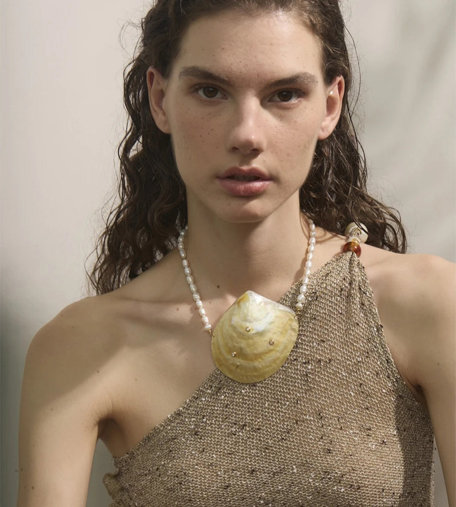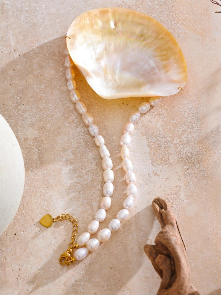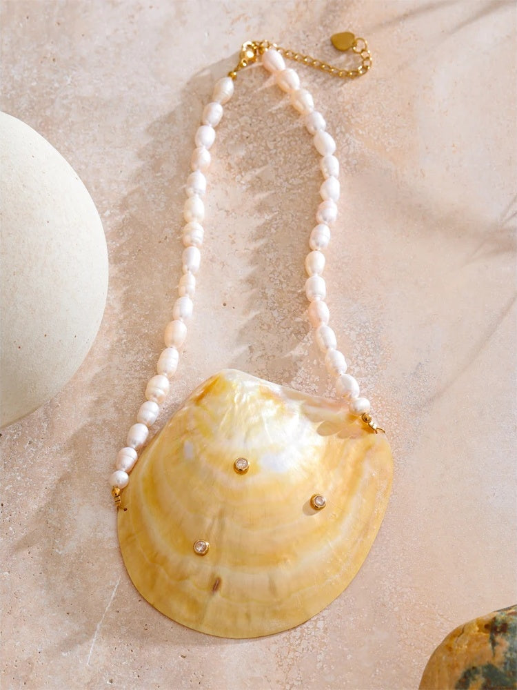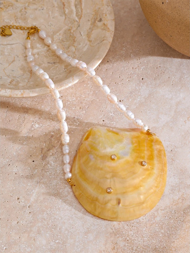 A fresh take on coastal-inspired elegance, this shell pendant necklace pairs an artful, oversized motif with a delicate strand of genuine freshwater pearls. Subtle geometric etching and small, sparkling accents catch the light with refined ease, while a durable PVD real gold–plated finish over stainless steel delivers a modern, polished look that’s made to be worn on repeat.