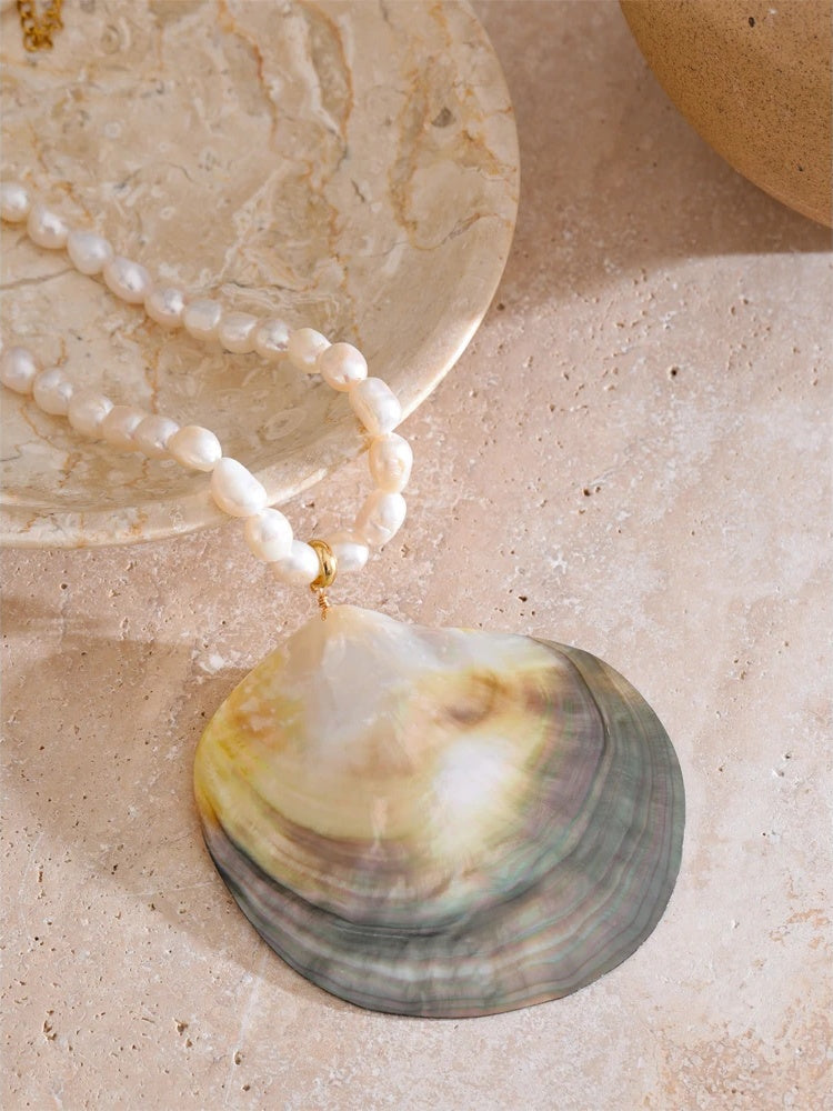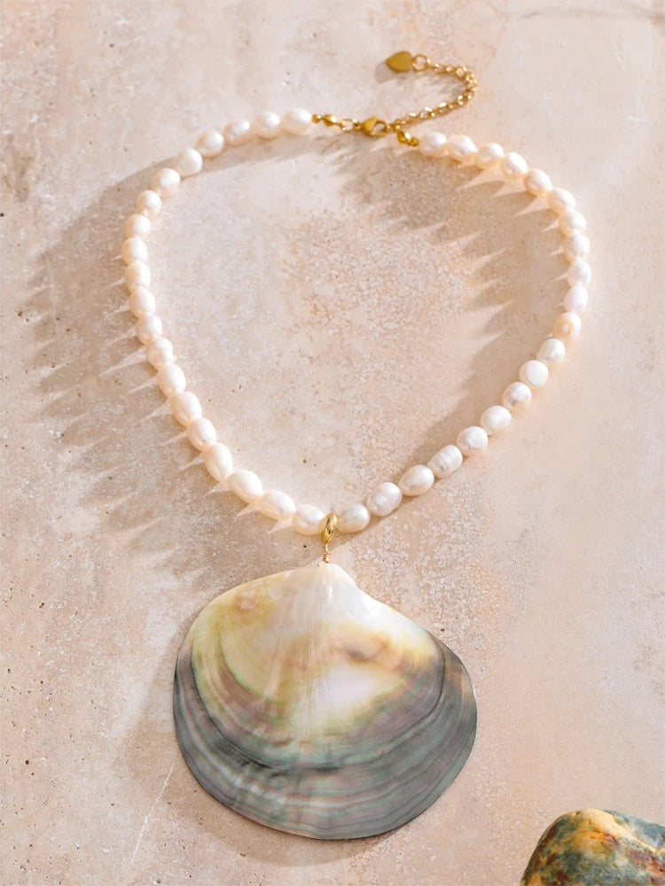Natural elegance meets modern design in this shell pendant necklace. A sculptural, geometric shell motif anchors the piece, while lustrous genuine freshwater pearls add soft shimmer and organic texture. Crafted with a durable stainless steel base and finished in real gold plating, it delivers a refined glow you can reach for day after day.