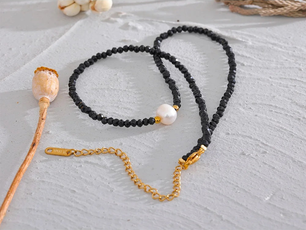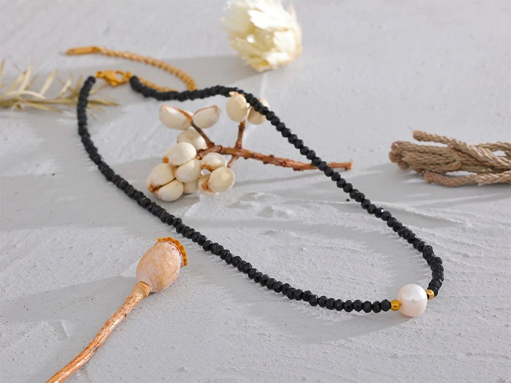 A striking necklace featuring a strand of faceted black crystal beads accented by a single natural pearl centerpiece. Crafted from durable stainless steel with a PVD gold plating finish, it offers both elegance and lasting wear. The geometric design balances simplicity with trend-forward style, making it suitable for a variety of occasions. Lightweight and handmade, it complements a wide range of outfits with subtle sophistication.