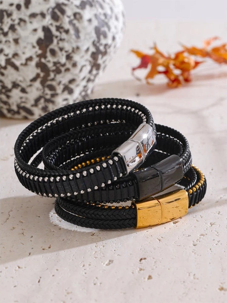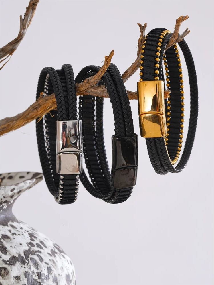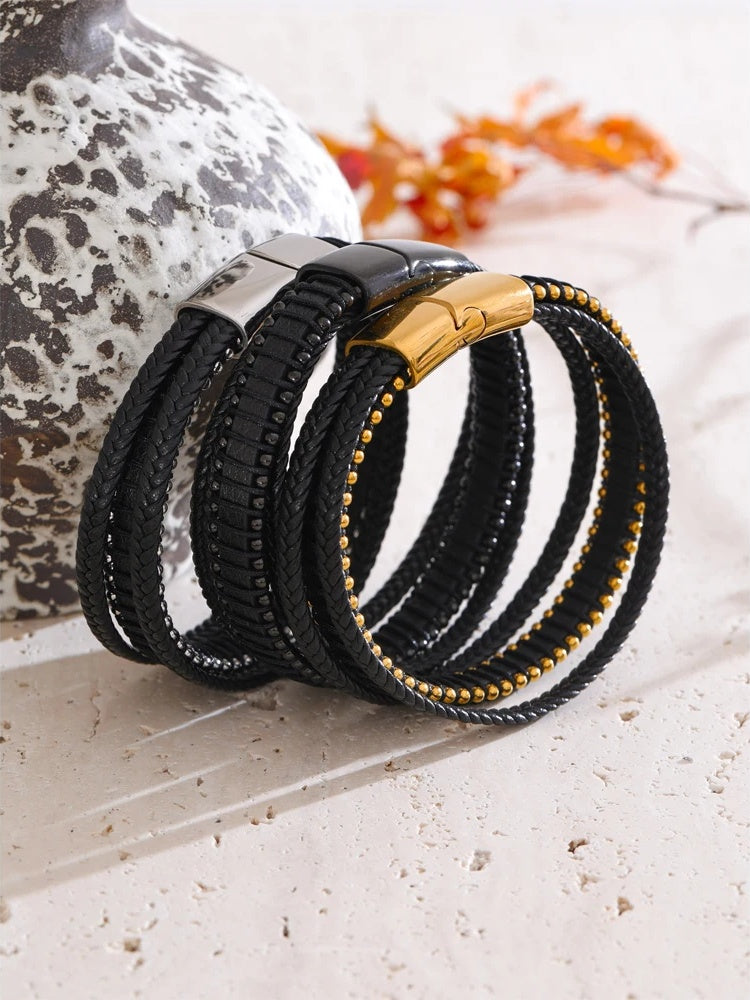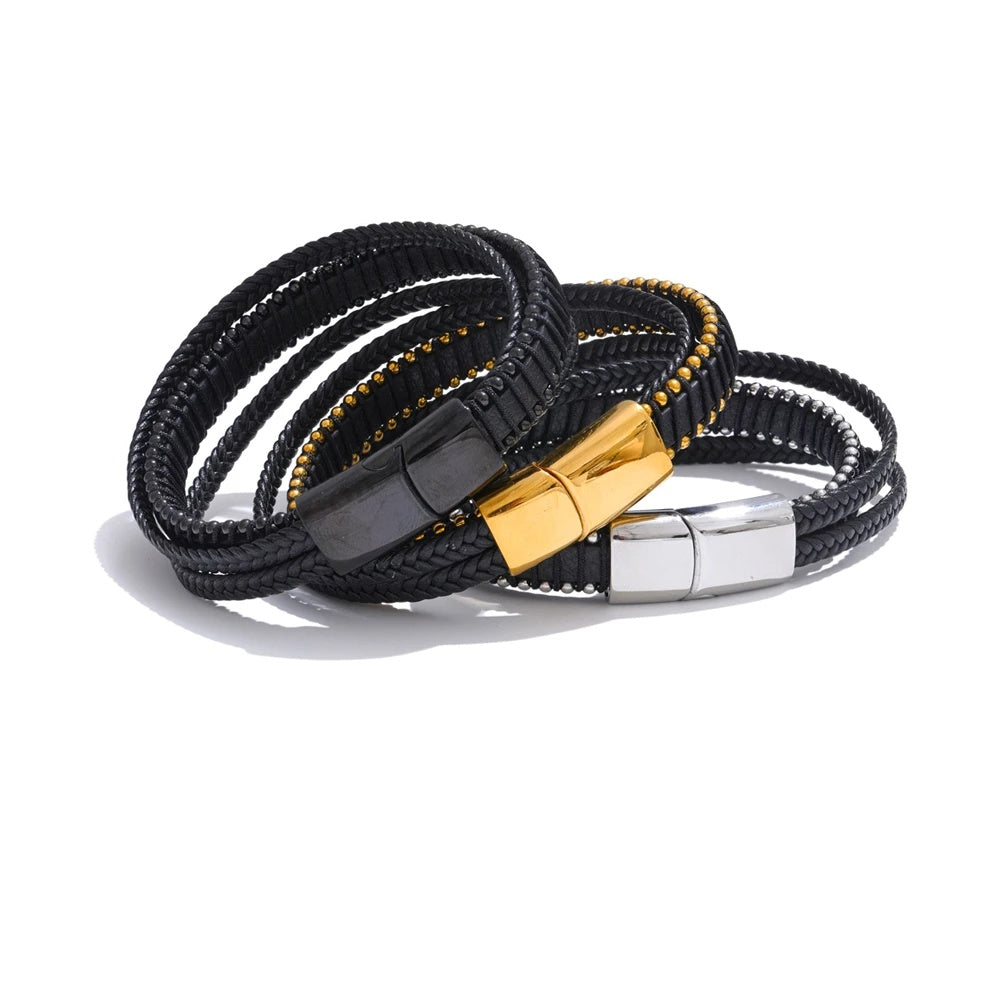 Elevate your everyday style with a bracelet that balances strength and sophistication. This men’s piece features braided black fiber leather for lasting durability and a sleek, layered look. A streamlined stainless steel clasp—available in black, gold, or silver finishes—adds a refined metallic contrast and a subtle geometric edge.