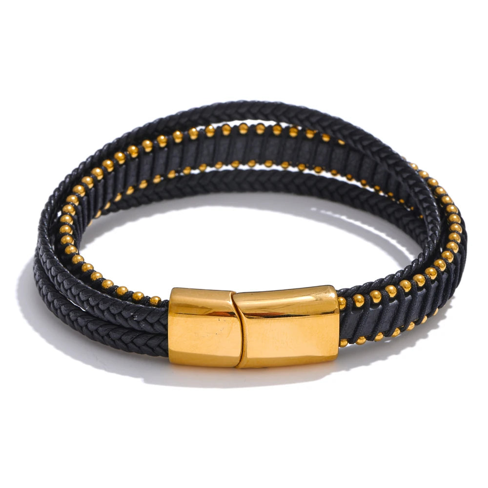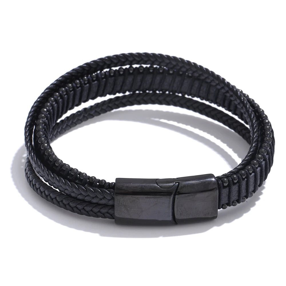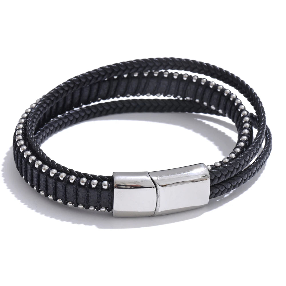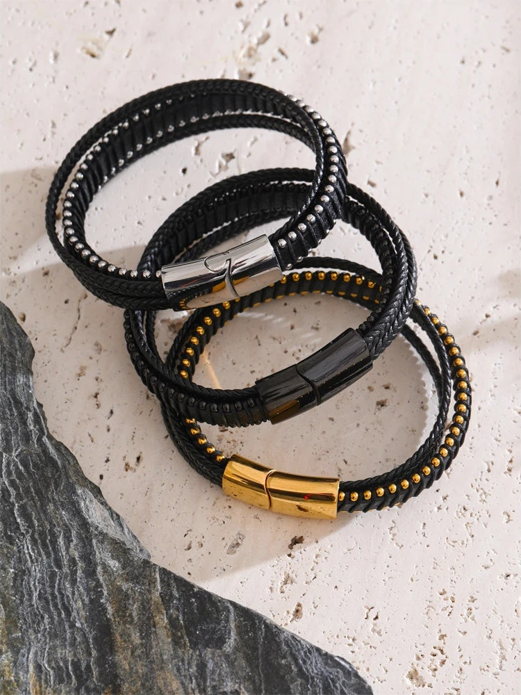 Elevate your everyday style with a bracelet that balances strength and sophistication. This men’s piece features braided black fiber leather for lasting durability and a sleek, layered look. A streamlined stainless steel clasp—available in black, gold, or silver finishes—adds a refined metallic contrast and a subtle geometric edge.