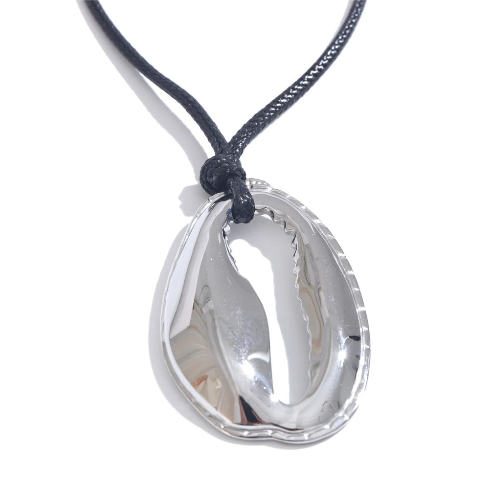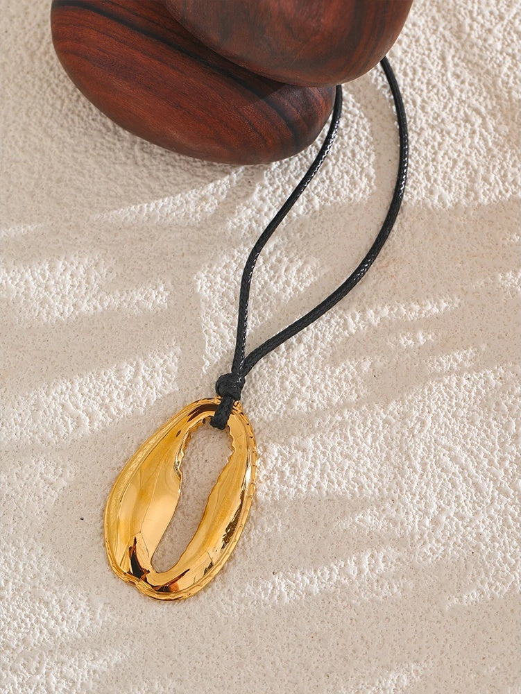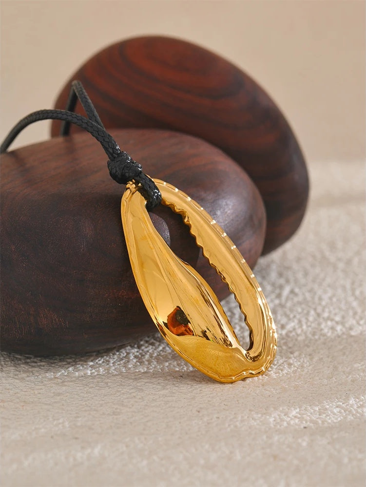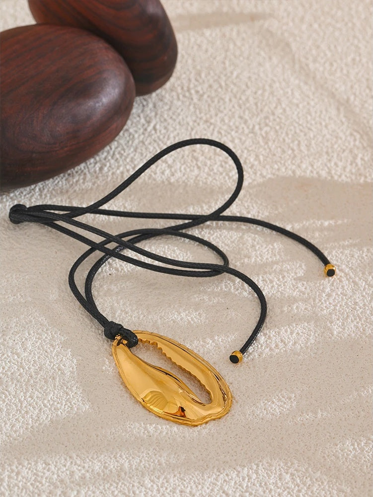 A black rope chain necklace featuring a polished metal shell pendant with a geometric design. Crafted from stainless steel with a PVD real gold-plated finish, it offers durability and a water-resistant quality. The pendant’s sleek and trendy style complements various outfits, making it a versatile accessory for everyday wear or gifting.