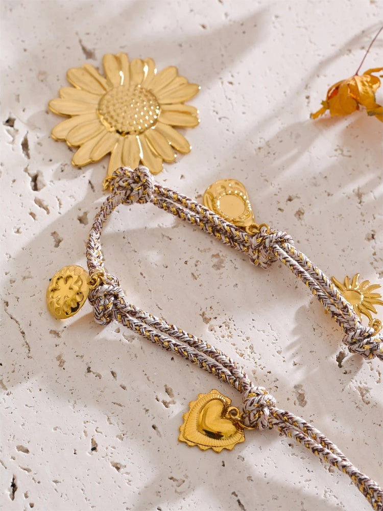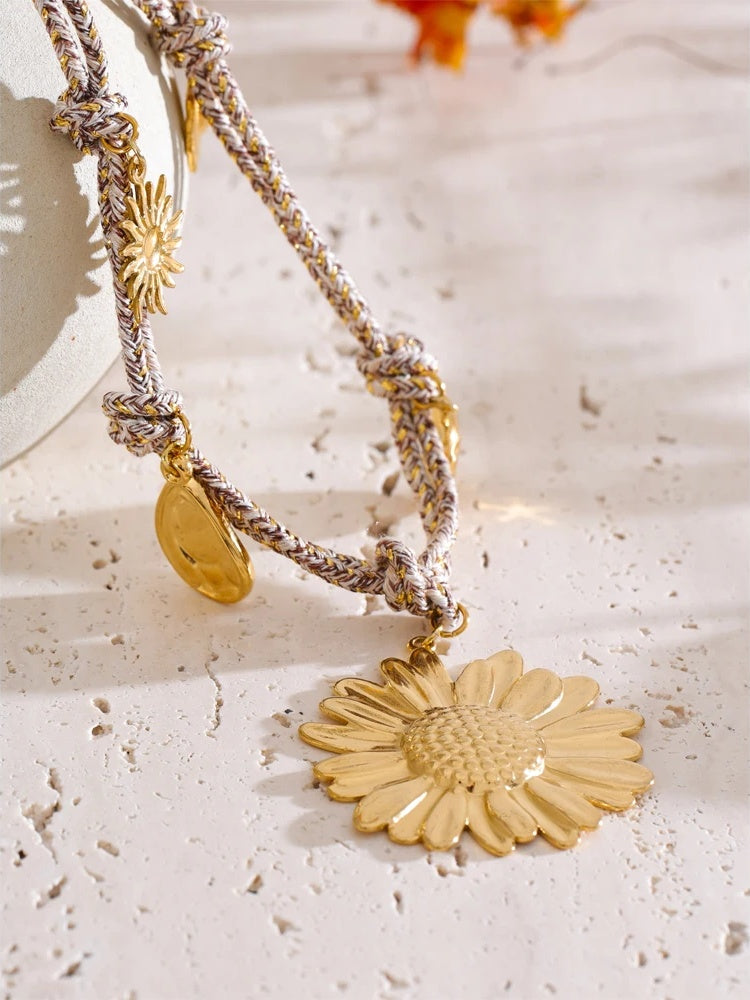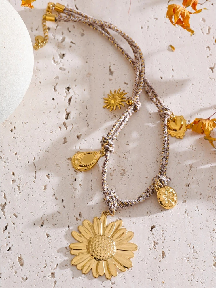 Featuring a braided rope design, this necklace showcases a bold sunflower pendant alongside various intricately crafted charms. Made from stainless steel with a PVD real gold plating, it offers lasting durability and a radiant finish. The trendy plant-inspired motifs provide a distinctive accessory that complements a variety of styles. Suitable for women, this necklace is a versatile addition to any jewelry collection.
