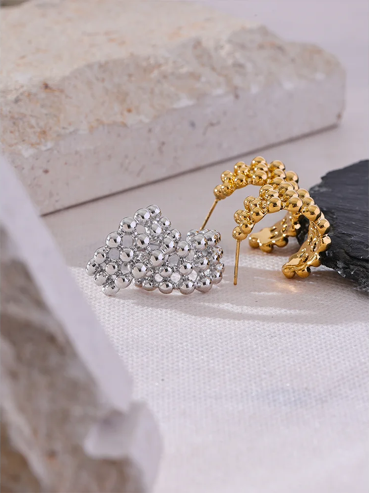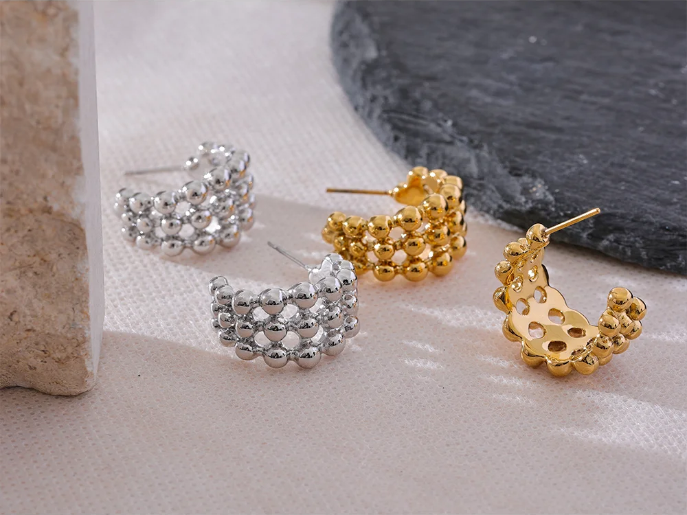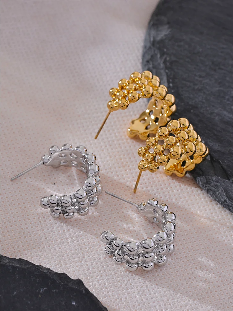 Crafted from stainless steel with a real gold PVD plating, these huggie earrings feature a distinctive C-shape design accented by layered hollow beads. The geometric pattern adds texture and dimension, making them suitable for everyday wear or special occasions. Lightweight and comfortable, they close securely for a seamless fit, combining trendy style with durable construction.
