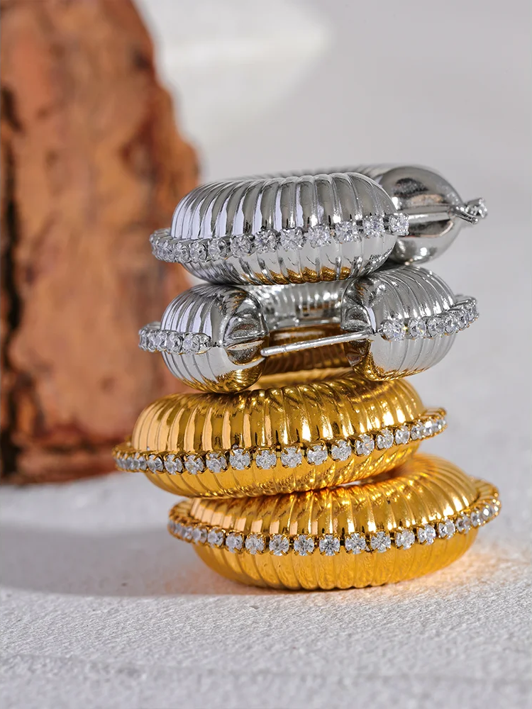Elevate your everyday look with these chunky C‑shaped hoop earrings—an elegant balance of sculptural texture and refined sparkle. Crafted from durable stainless steel and finished with high‑quality PVD real gold plating, these gold‑plated earrings are designed for a lasting, mirror‑like shine. A ribbed metal surface frames a clean row of sparkling cubic zirconia along the outer edge, creating a distinctive geometric silhouette that catches the light beautifully.