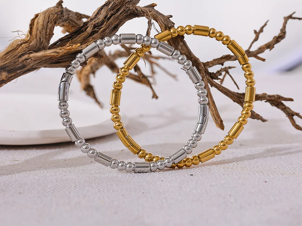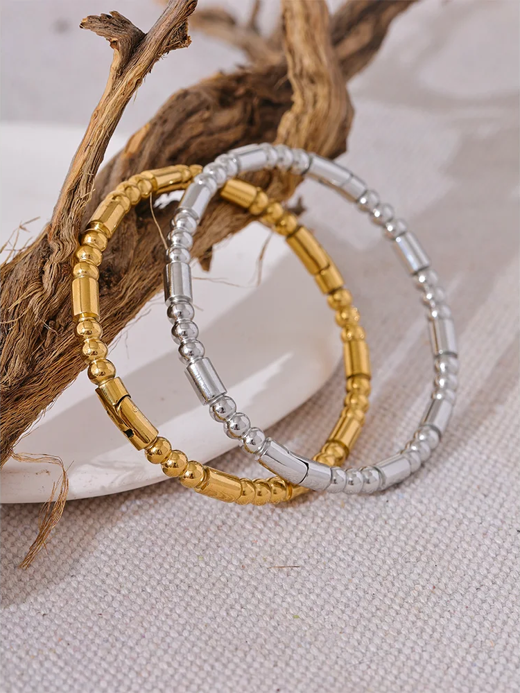 Elevate your everyday style with a modern bangle that balances clean geometry and refined texture. This stainless steel bracelet features a distinctive geometric, cast-bead pattern and a smooth, comfortable interior. Finished in a lustrous gold-tone plating, it offers a sleek metallic shine designed to resist everyday wear and water exposure—so it looks polished day after day.