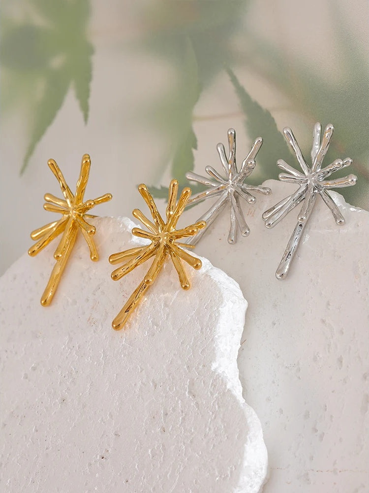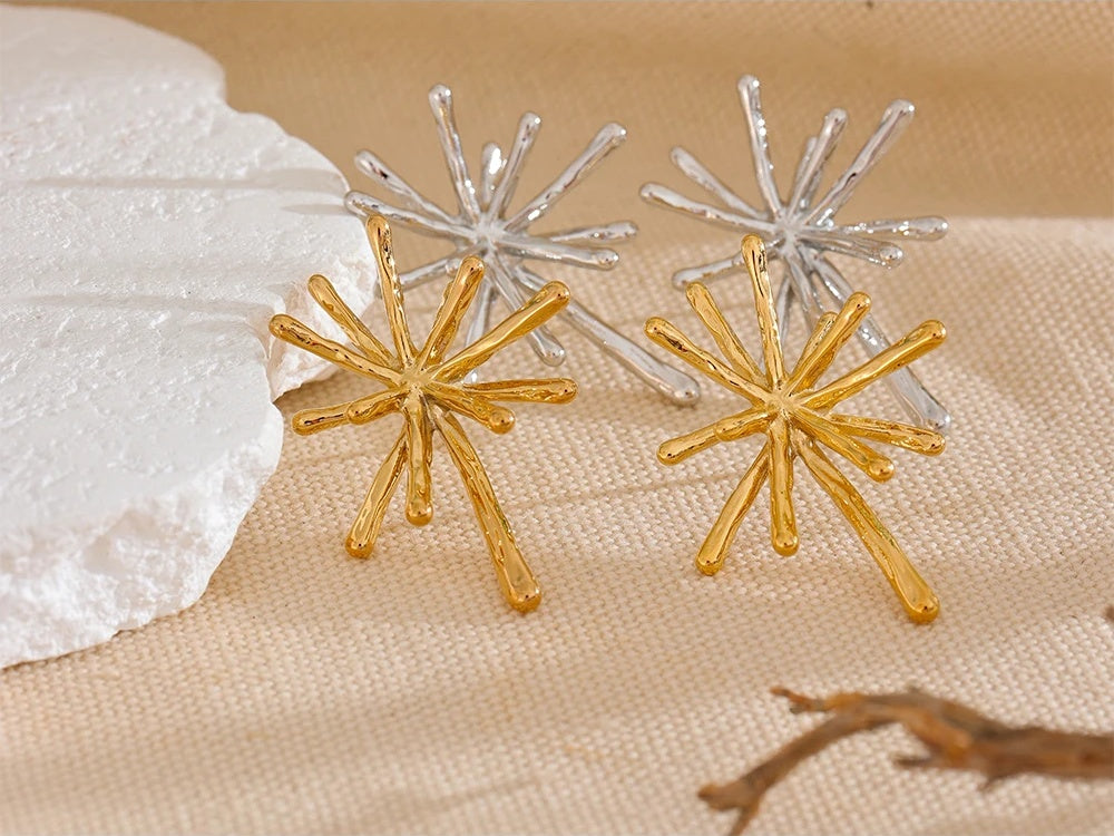 Crafted from durable 316L stainless steel with an 18K PVD real gold plating, these stud earrings feature a unique textured firework-inspired design. The push-back closure ensures secure and comfortable wear throughout the day. Resistant to water and everyday wear, they maintain their shine and charm, making them a versatile accessory for various occasions. The geometric pattern adds a modern, trendy touch to any outfit.