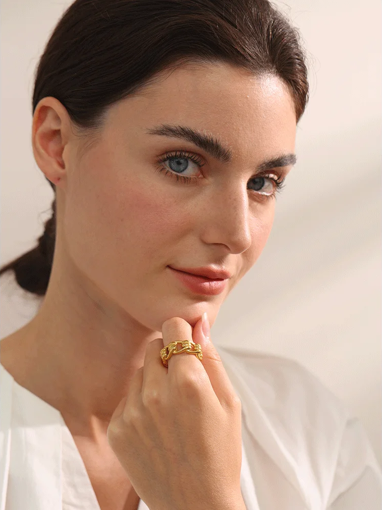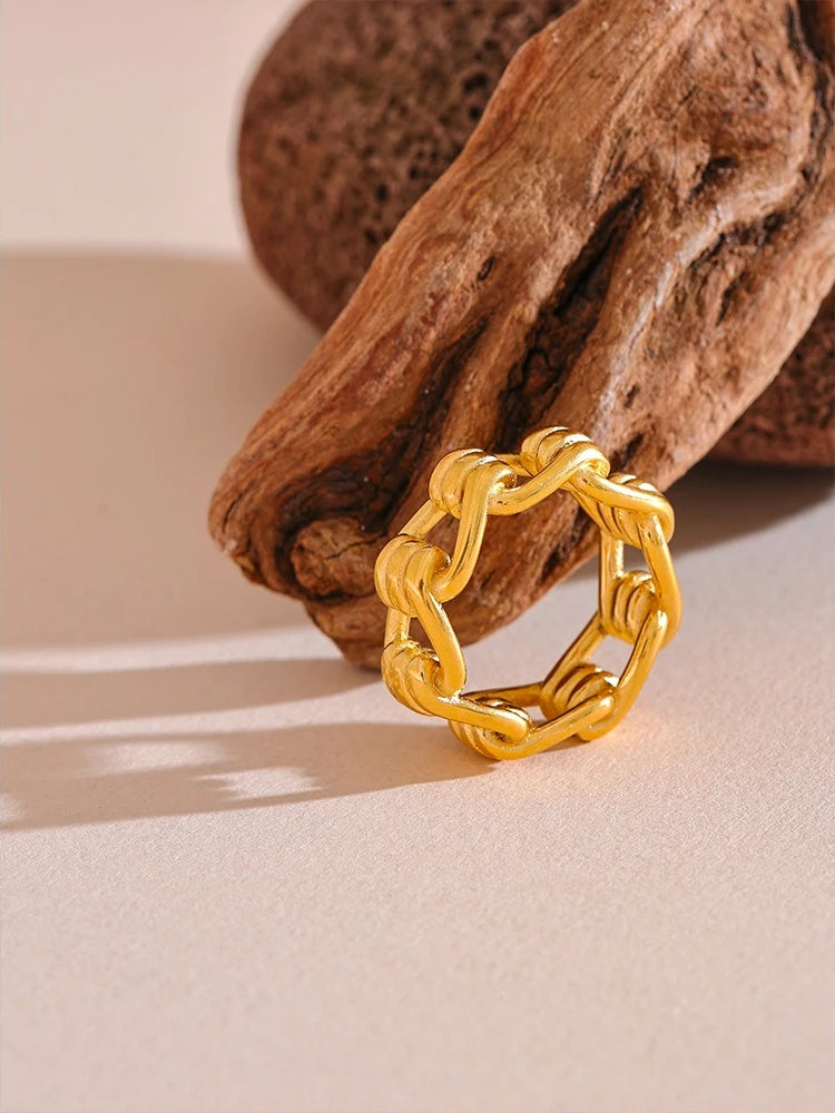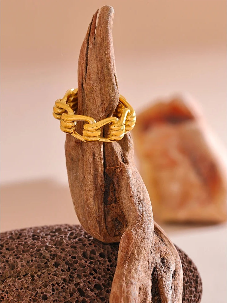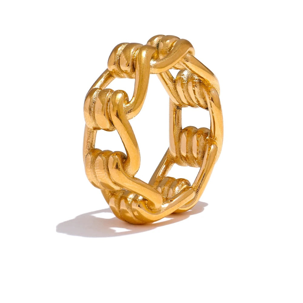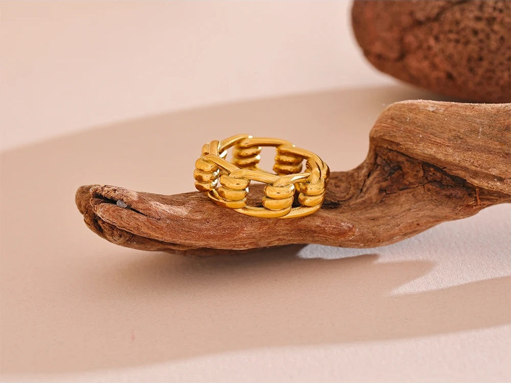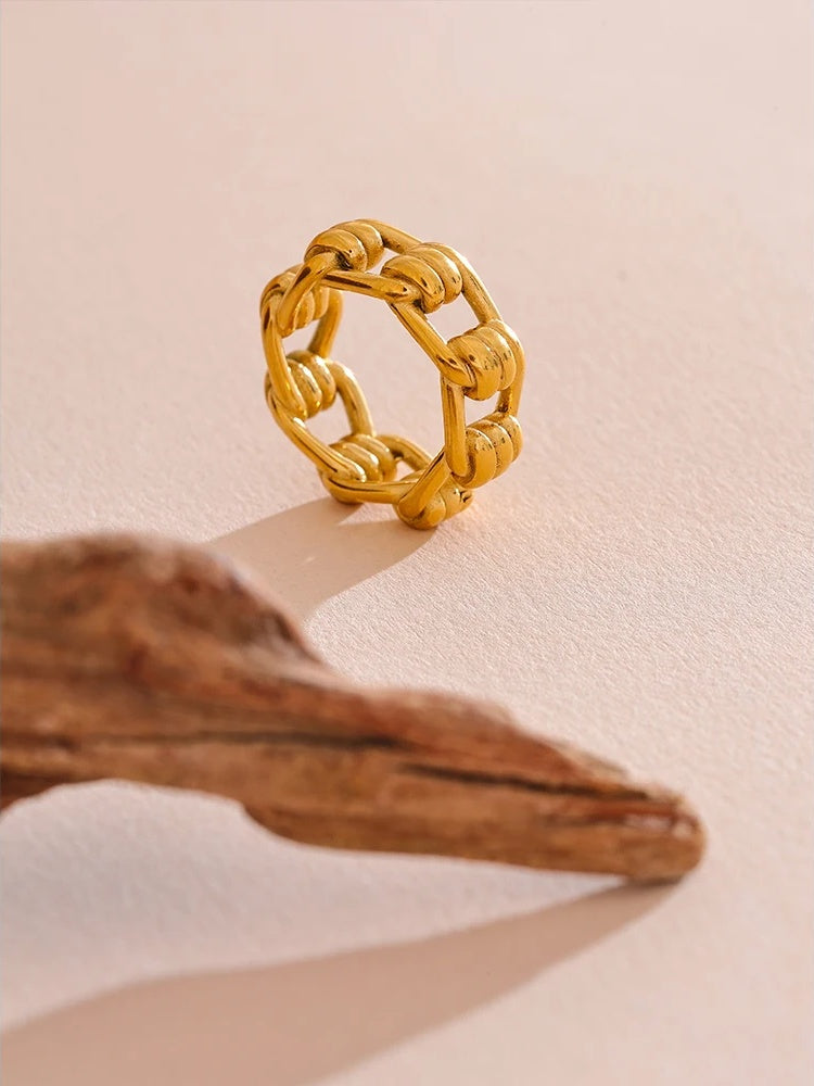 Crafted from durable stainless steel with an 18k gold-plated finish, this chain-inspired hollow ring offers a bold, geometric design for a distinctive look. The minimalist structure ensures lightweight comfort while maintaining a statement-making presence. Water-resistant and compatible with all ring sizes, it suits a variety of occasions, from casual gatherings to stylish parties.