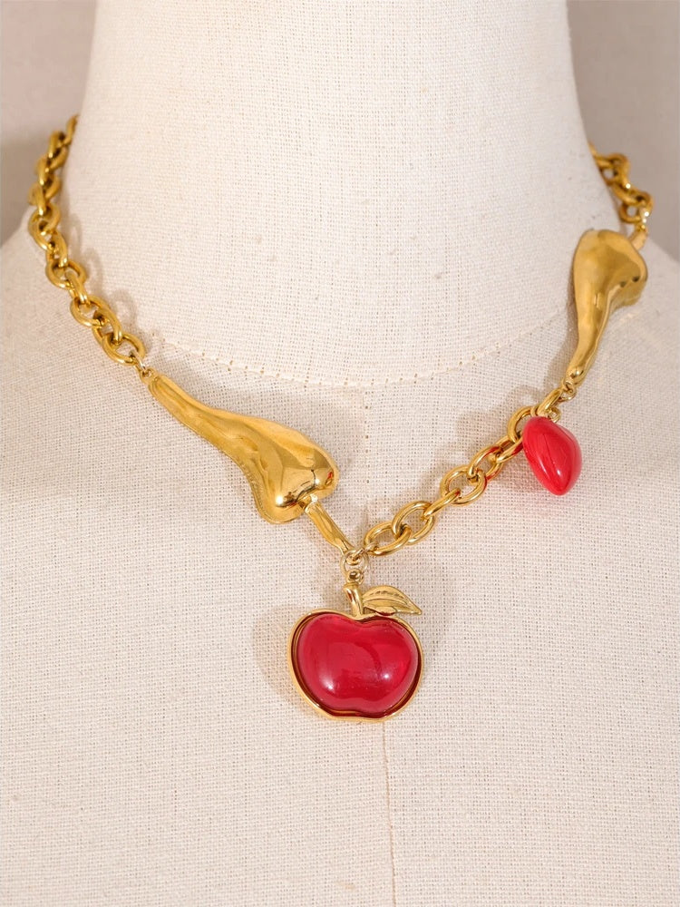 Make a modern statement with this gold-plated stainless steel necklace, defined by sculptural chili-shaped links and a glossy red enamel heart-apple pendant. The high-polish finish catches the light, while the resin-filled heart delivers a rich, saturated pop of color—striking on its own and effortless to layer.