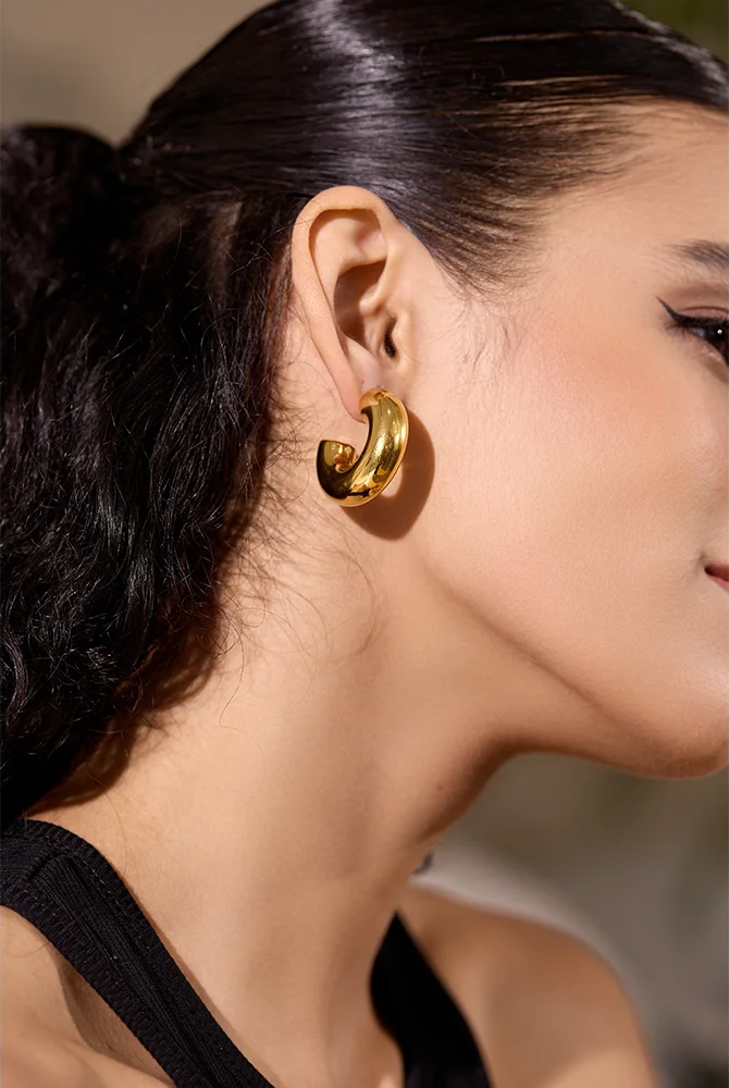 Chunky C-shaped huggie earrings crafted from durable stainless steel with a sleek, polished finish. Available in both gold and silver tones, these earrings feature an 18K PVD plating process that ensures long-lasting shine and resistance to water. Designed with a bold geometric silhouette, they offer a trendy statement look while remaining comfortable and hypoallergenic for sensitive skin.