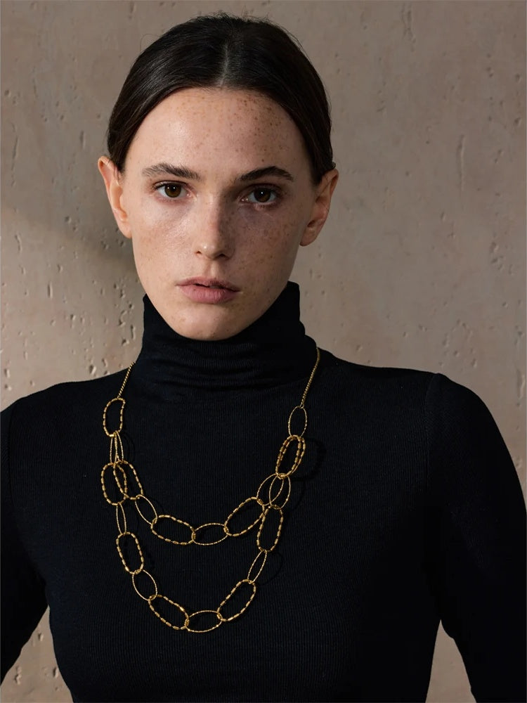 - Design: Double-layer silhouette featuring contrasting round and elongated links that create a polished, contemporary look.