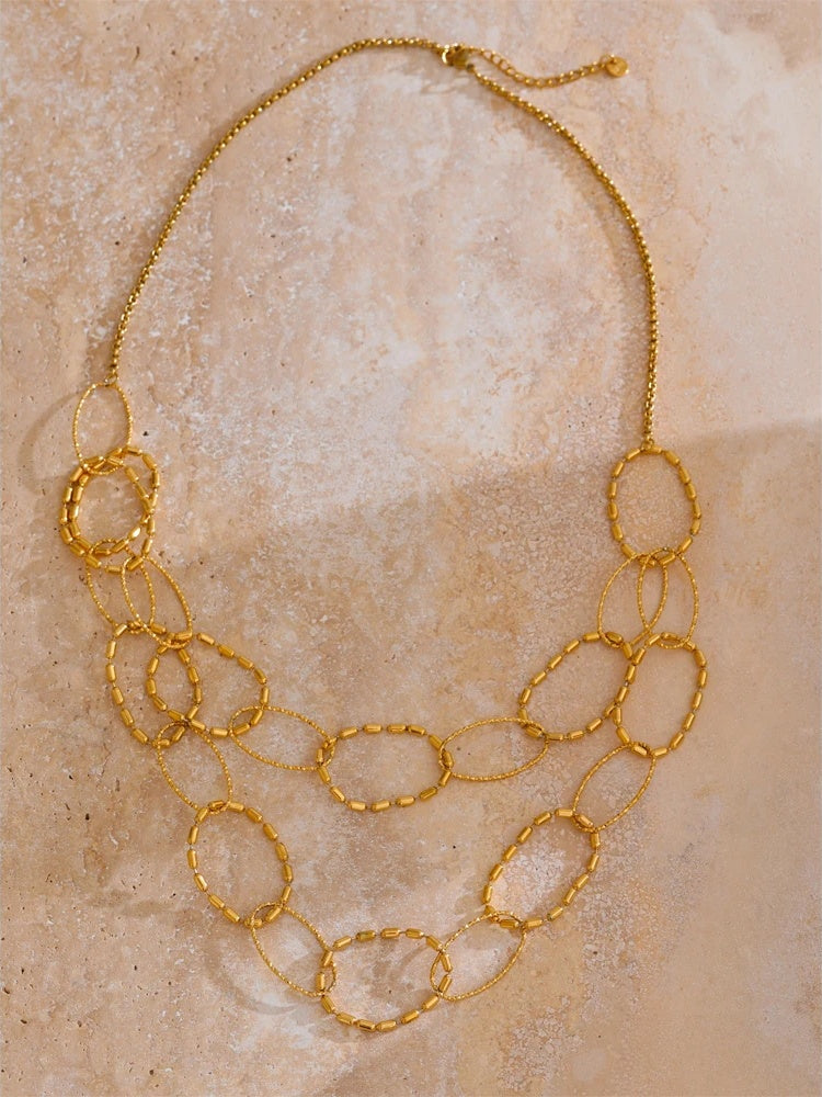 Elevate your everyday with a modern layered link chain designed to shine. Crafted from durable stainless steel and finished with PVD real-gold plating, this double-layer necklace showcases interlocking round and elongated links for sculptural dimension—bold enough to stand alone, refined enough to layer.