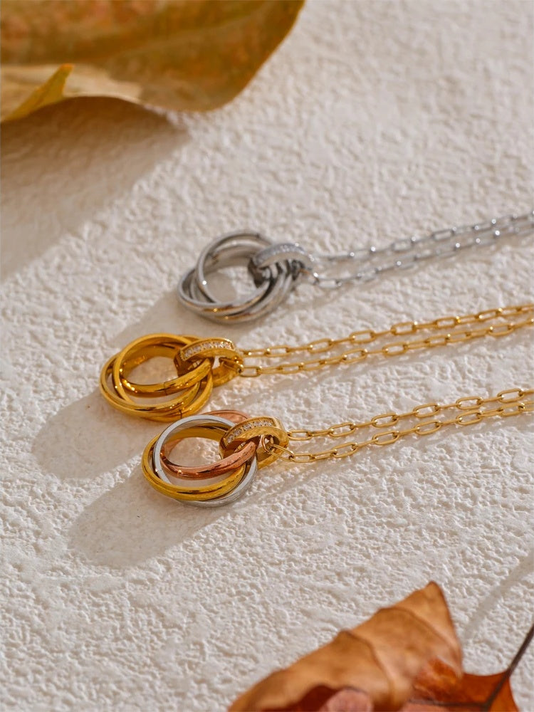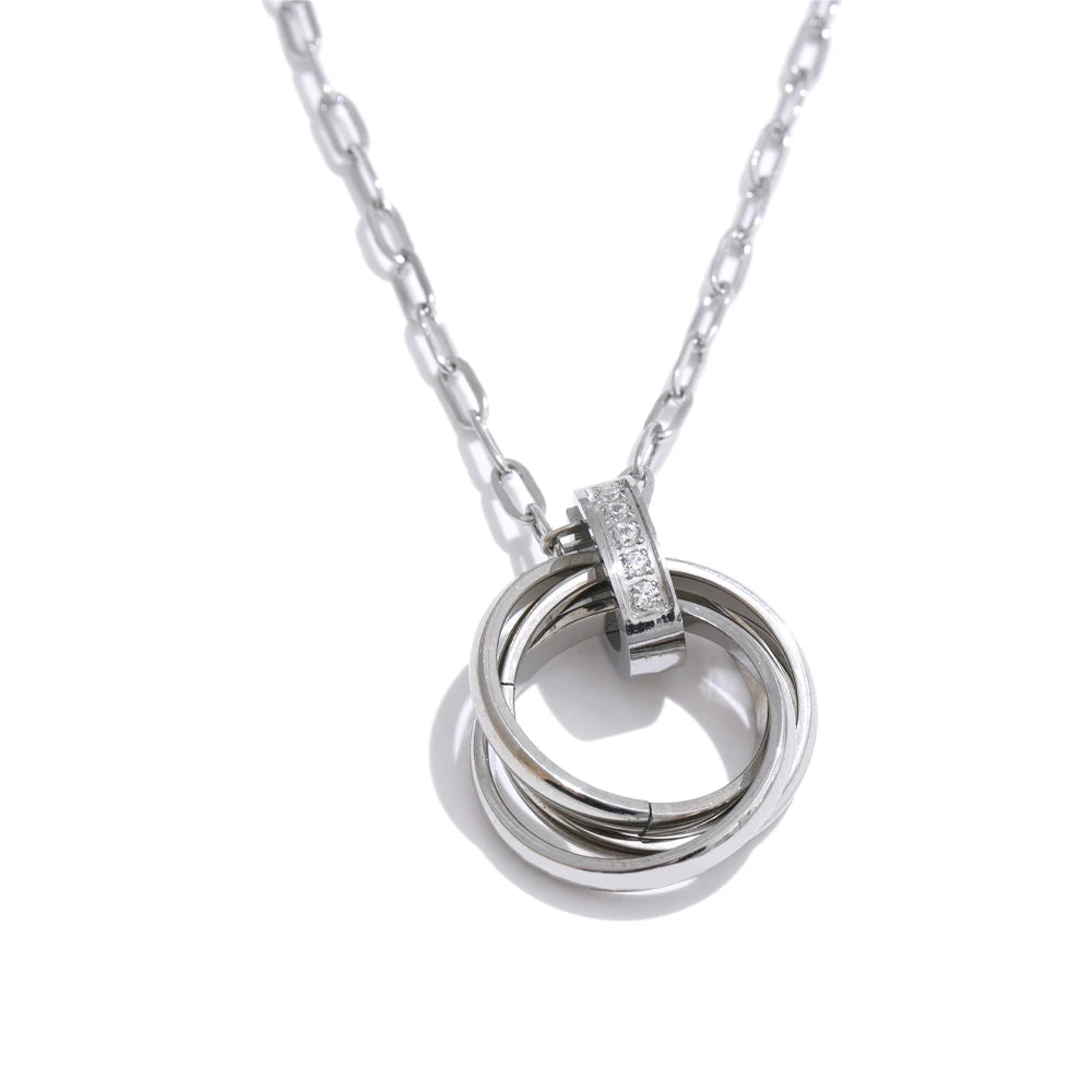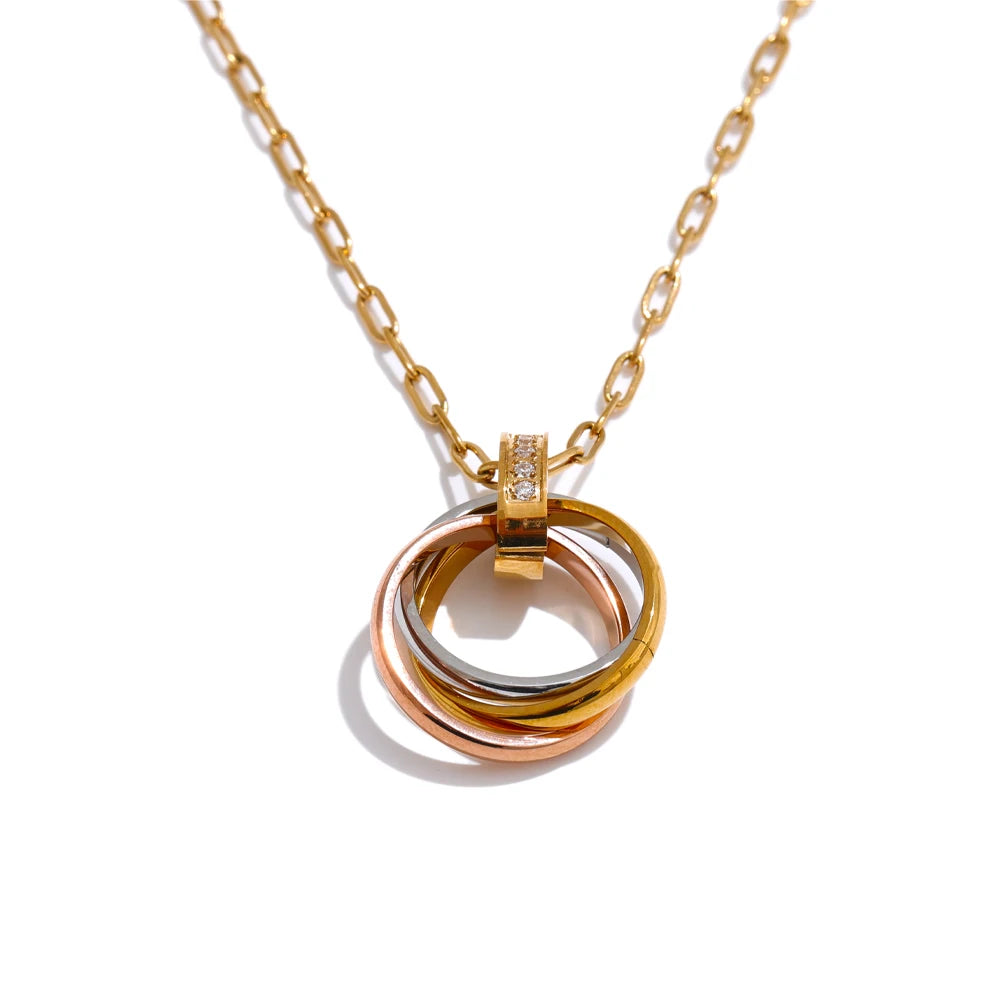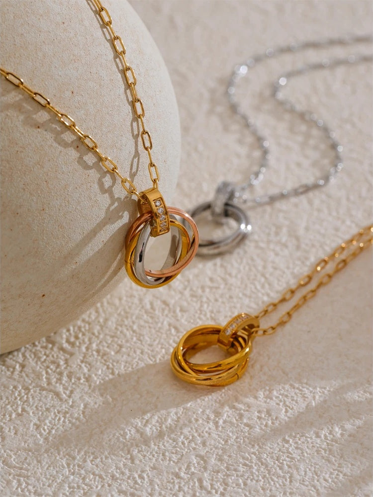Refined and radiant, this layered round pendant brings modern dimension to your everyday jewelry. Crafted from durable stainless steel and finished with a polished PVD gold plating, it features a hollow, openwork charm that catches the light while remaining comfortably lightweight. Sparkling cubic zirconia accents add a subtle touch of brilliance, creating a dainty gemstone–inspired look that transitions effortlessly from day to night.