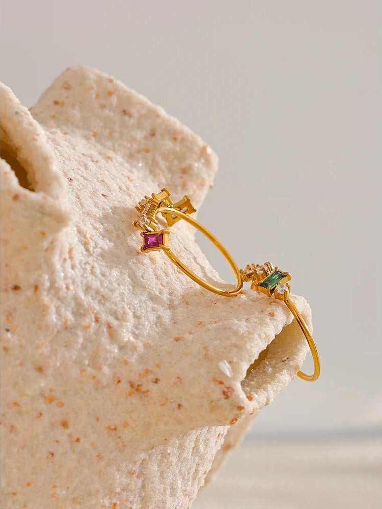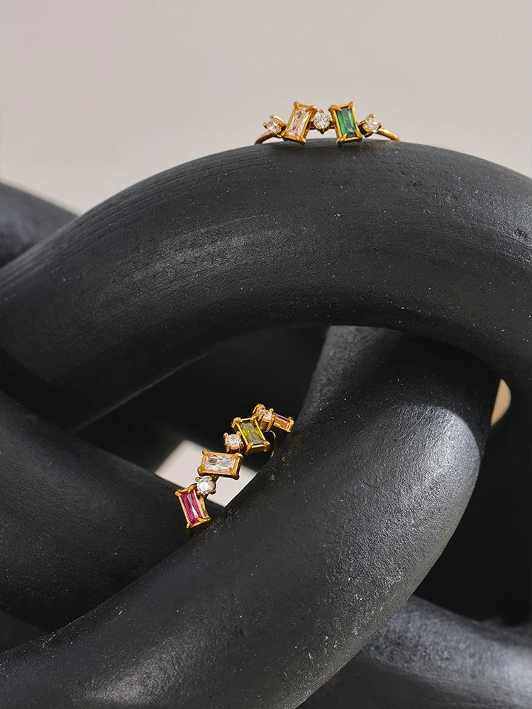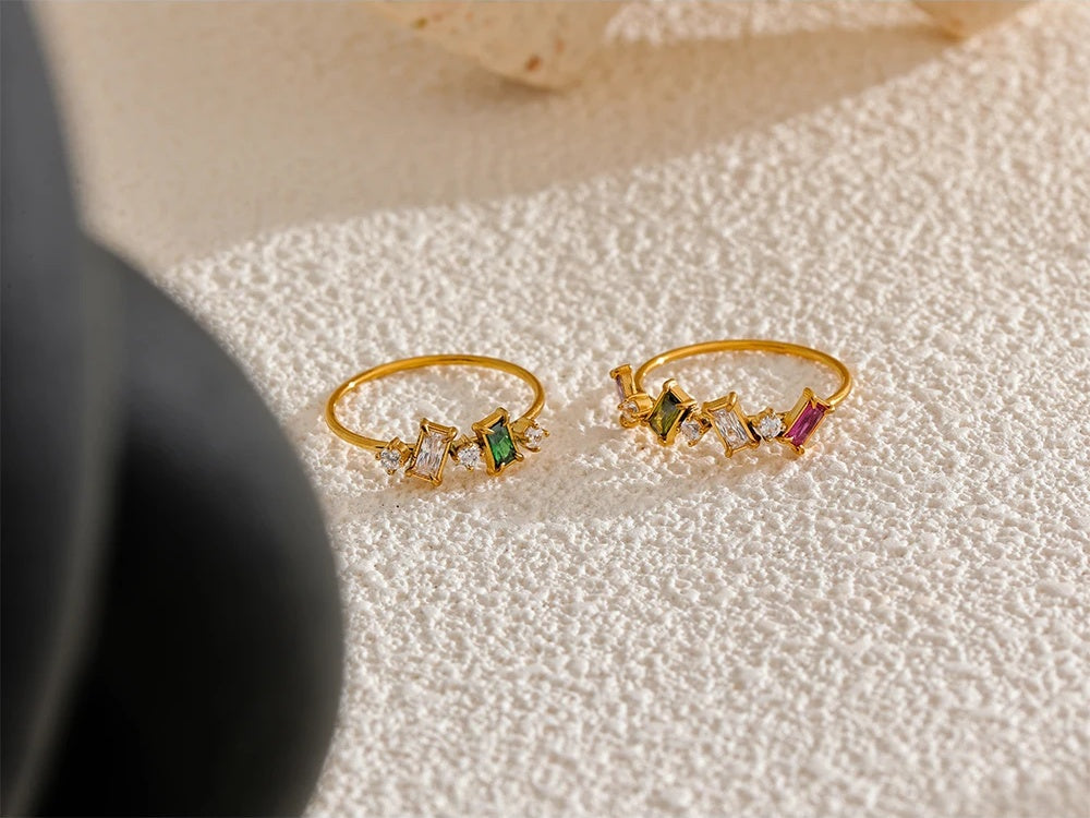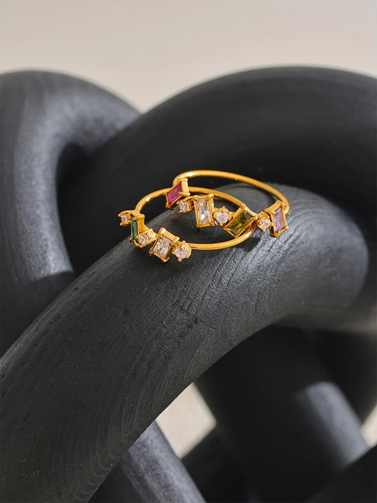 Crafted with waterproof stainless steel and finished with 18k gold plating, this thin fashion ring features a vibrant arrangement of colorful cubic zirconia stones set in a geometric pattern. Its lightweight design combines durability with trendy elegance, making it suitable for parties and everyday wear. Available in various sizes and stone color options, the ring offers a chic, contemporary look that complements any style.