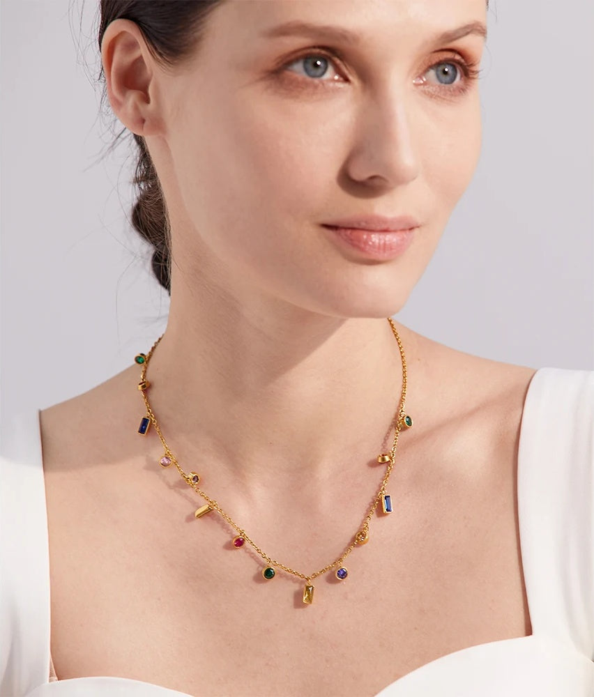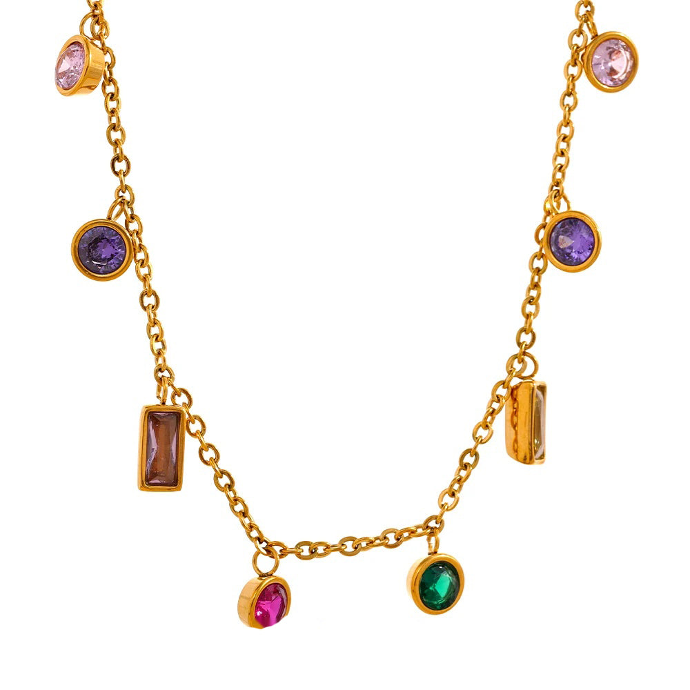 Elevate every outfit with this refined two-piece jewelry set featuring a matching necklace and bracelet. Crafted from durable stainless steel and finished with PVD real gold plating, each piece is adorned with colorful cubic zirconia in clean geometric shapes. The polished gold tone and vibrant stones create a playful yet elegant look that transitions effortlessly from weekday minimalism to weekend celebrations.