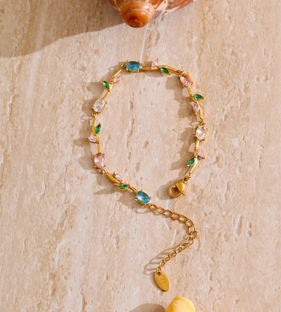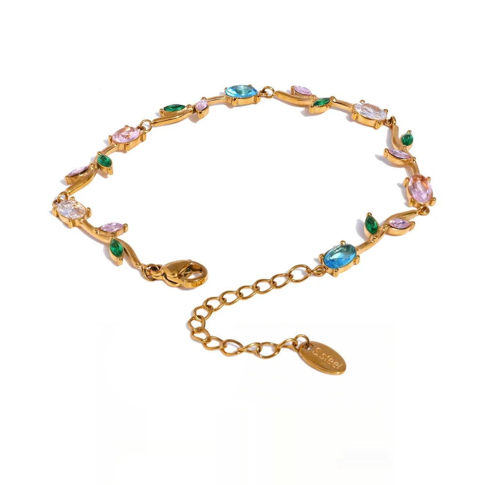Featuring a delicate leaf chain design, this bracelet combines colorful cubic zirconia stones set in polished stainless steel for a vibrant, eye-catching look. The lobster-claw clasp ensures secure wear, while the adjustable chain provides a customizable fit. Electroplated with real gold, this piece offers lasting shine and durability, making it a fashionable addition to any jewelry collection.