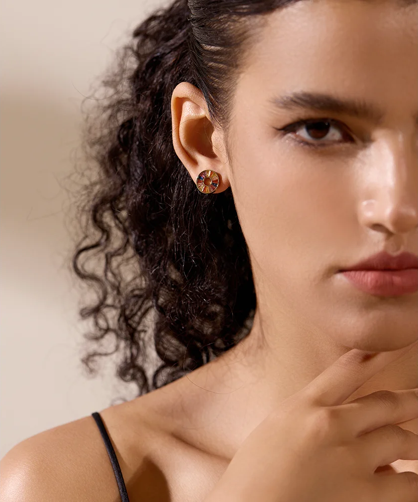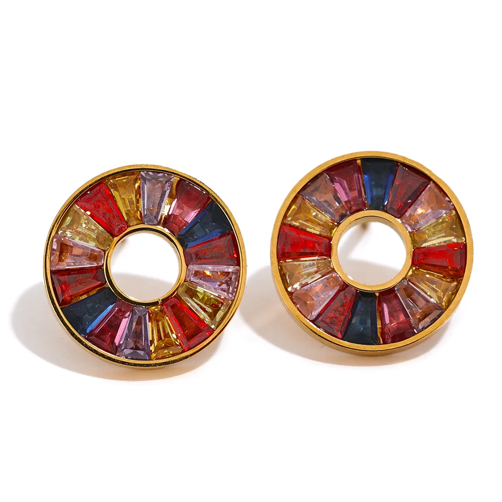 Round stud earrings featuring vibrant cubic zirconia stones set in durable 316L stainless steel with a high-quality PVD gold or silver plating. Designed with a push-back closure for secure and comfortable wear, these earrings showcase a stylish open-center circle pattern. Available in both colorful and clear stone options, they provide a trendy and eye-catching accessory suitable for various occasions.