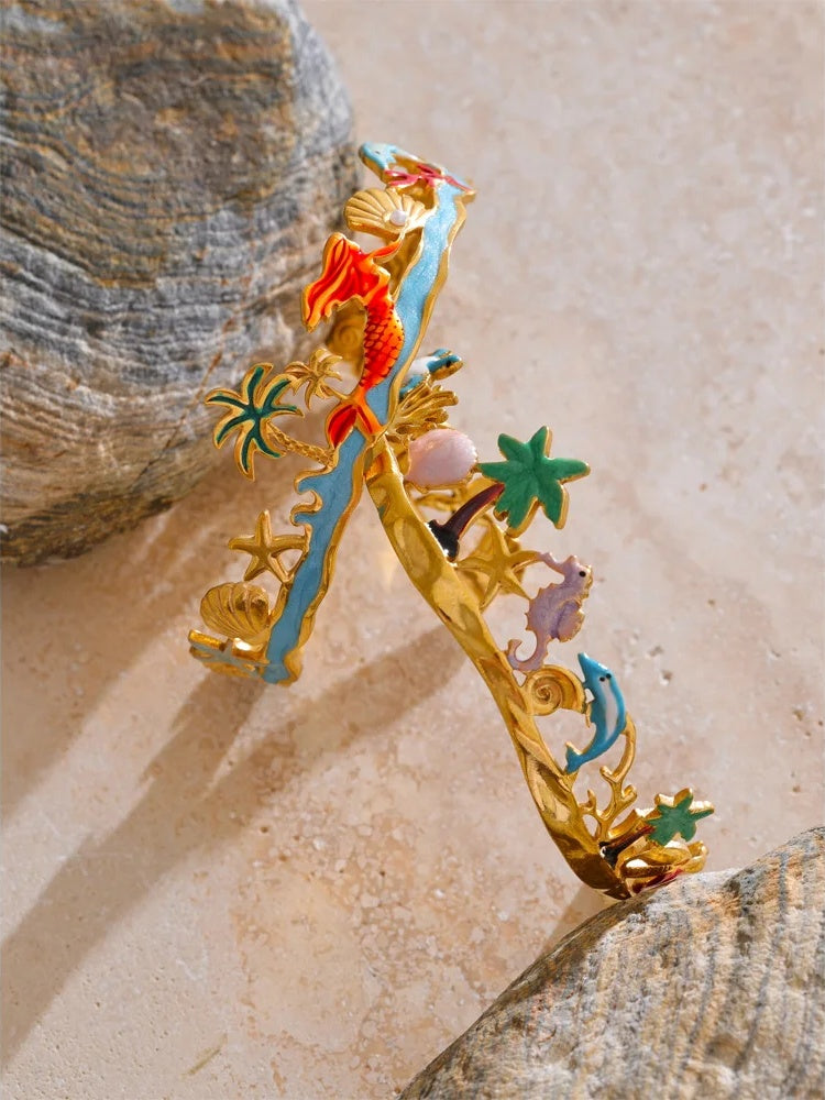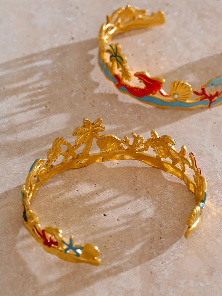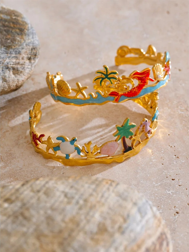 Crafted from gold-color stainless steel, these colorful enamel cuff bracelets feature intricate ocean-inspired designs with dolphins, turtles, palm trees, and seashells. The open bangle style ensures easy wear and a comfortable fit for all wrist sizes. Durable and stylish, each piece combines geometric patterns with vibrant enamel accents for a unique, summery look. Perfect for adding a playful yet elegant touch to any outfit.