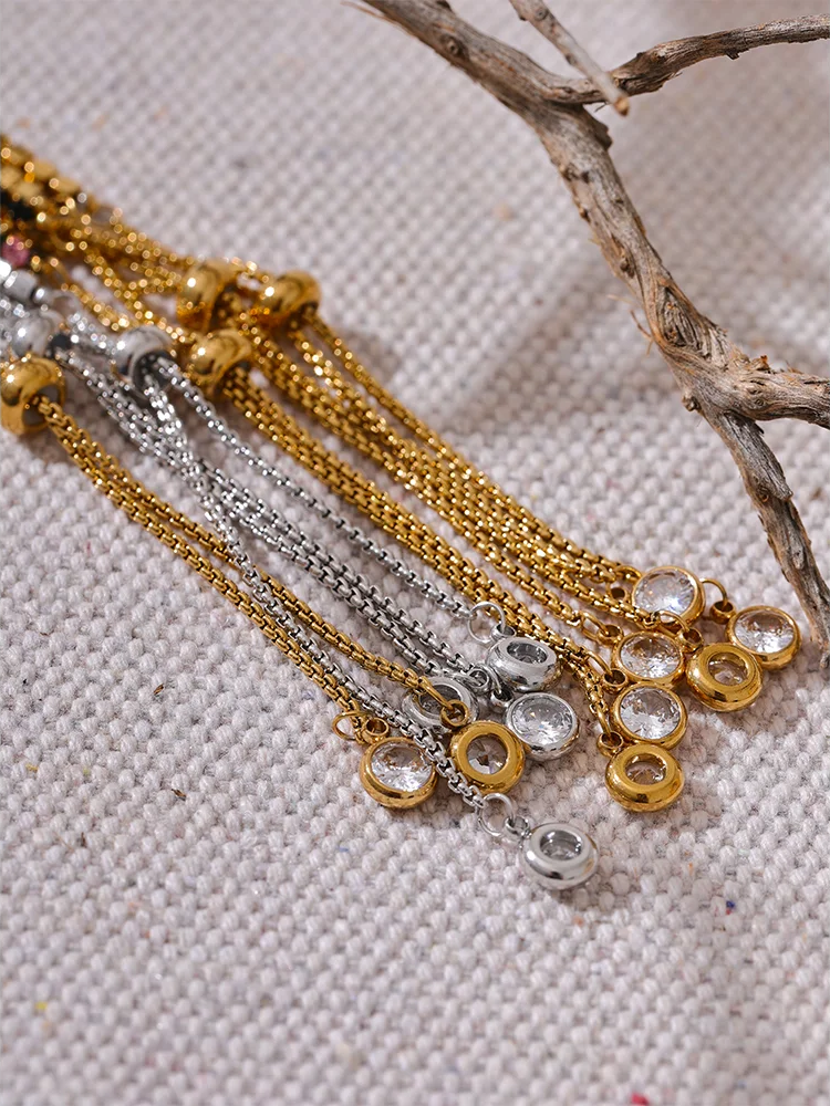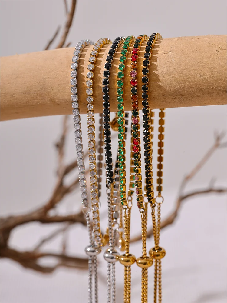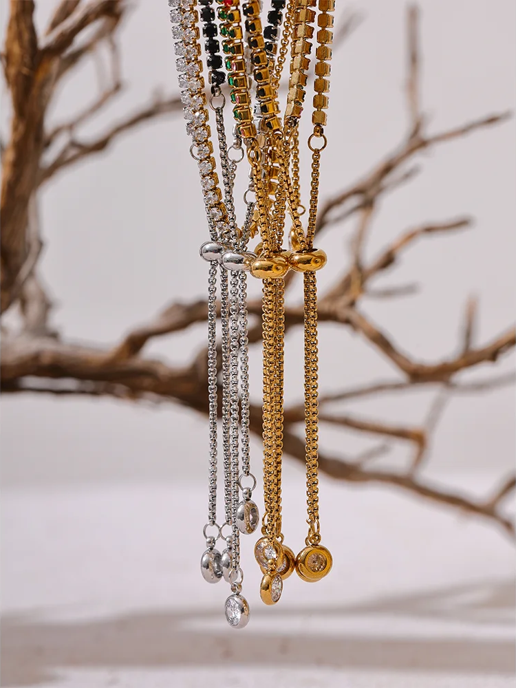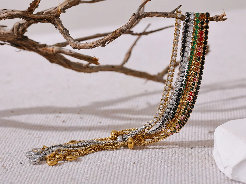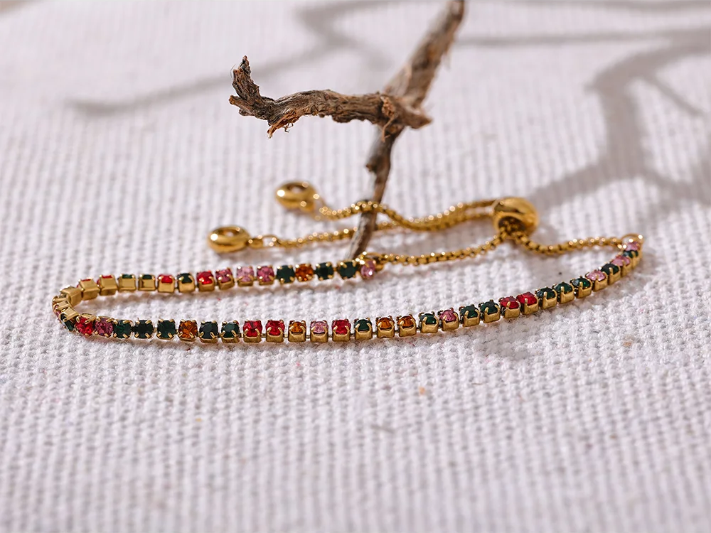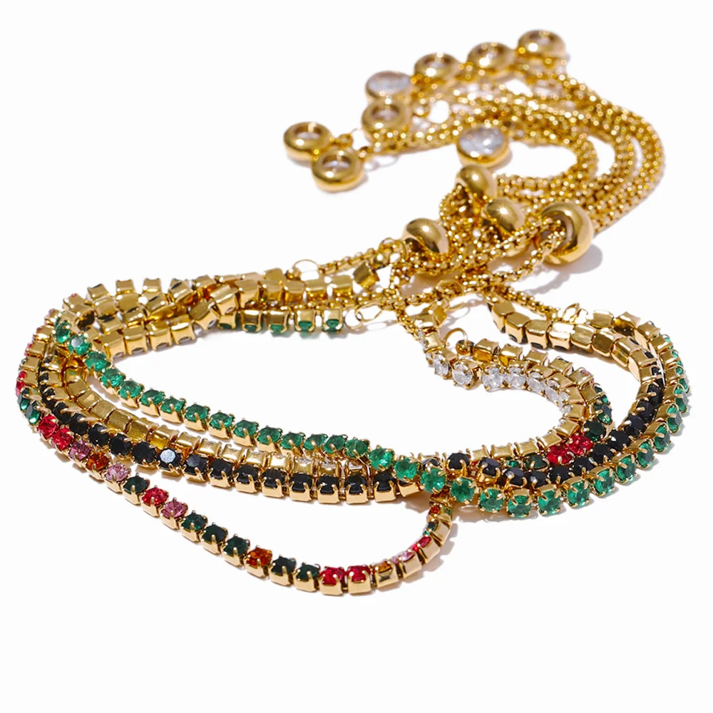 Crafted from stainless steel with a polished PVD real gold plating, this bracelet features vibrant cubic zirconia stones set in a prong style for maximum sparkle. The multi-chain design showcases an elegant geometric pattern with colorful stones that catch the light beautifully. Adjustable and compatible with all wrist sizes, it blends trendy fashion with durable materials, making it suitable for everyday wear or special occasions.