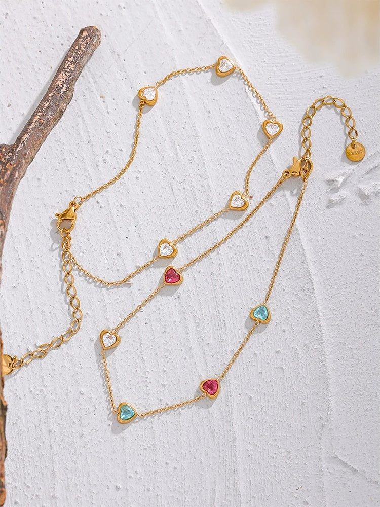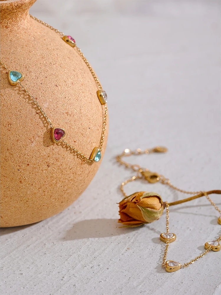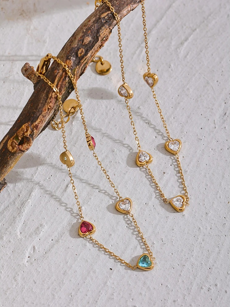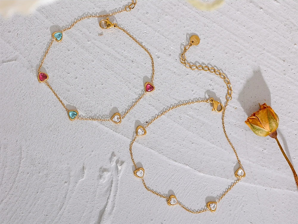 Crafted from stainless steel with a PVD real gold plating, this anklet features delicate heart-shaped cubic zirconia stones in vibrant colors. The adjustable chain measures 20.5+5.5cm, ensuring a comfortable fit for various ankle sizes. Its lightweight and trendy design makes it an ideal accessory for summer and everyday wear. Hypoallergenic and free from high-concern chemicals, it offers both style and skin-friendly wearability.