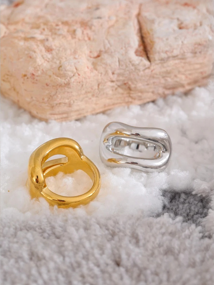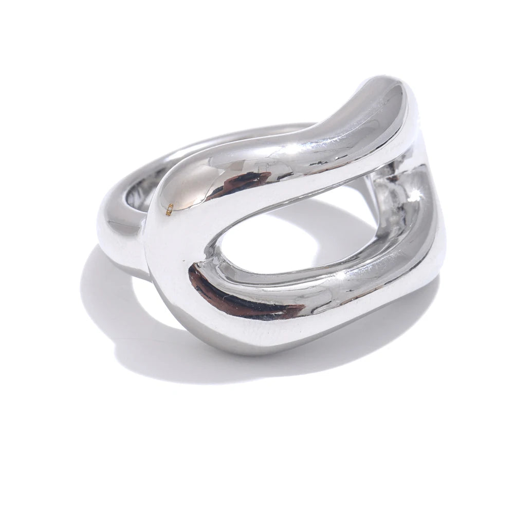 This geometric ring elevates casual outfits and complements evening looks alike—wear it solo for a sleek, architectural touch or stack it with slim bands for a curated, modern set. Its understated form makes it an easy match for other stainless steel jewelry and gold-plated accessories.