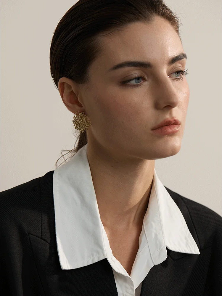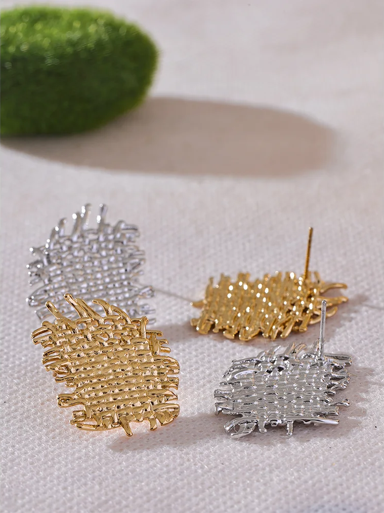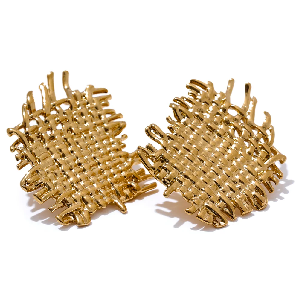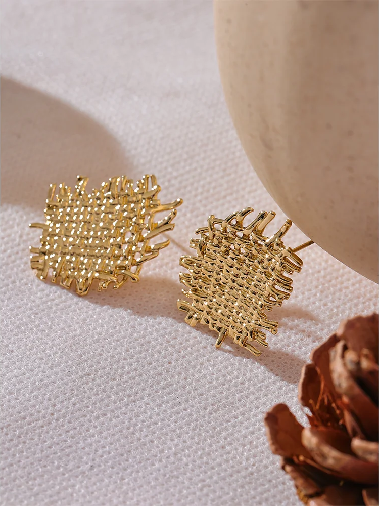 Elevate your everyday with these geometric stud earrings from Hoops & Gems. Crafted from durable stainless steel and finished with high‑quality gold plating, their distinctive woven texture adds modern dimension and a refined glow. A secure push‑back fastening ensures a comfortable fit, while the water‑resistant finish helps maintain their shine through day‑to‑day wear.