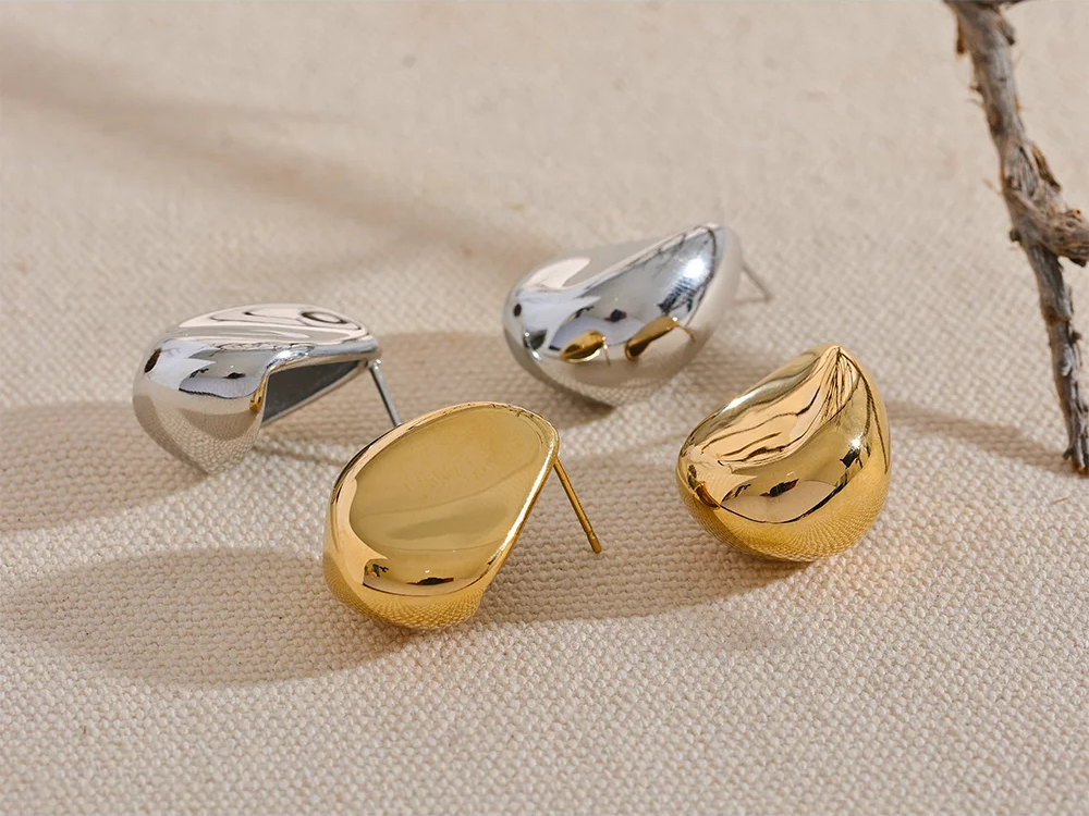 Crafted from durable 316L stainless steel, these stud earrings feature a smooth, polished surface with a creative geometric shape. The high-quality 18K gold plating offers a luxurious finish that is resistant to water and tarnish. Designed with a secure push-back closure, they provide comfortable all-day wear. Their minimalist yet trendy style makes them a versatile accessory for various occasions.