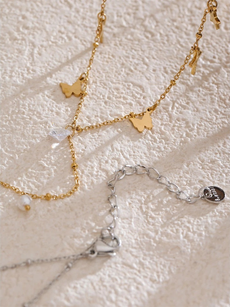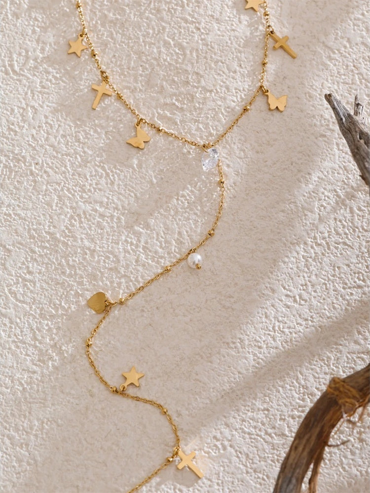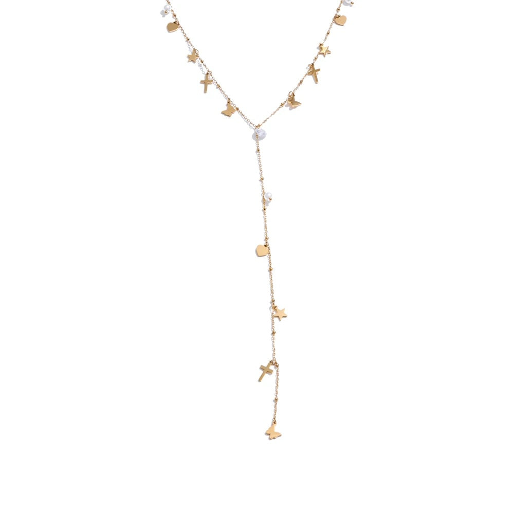 Featuring a delicate Y-shaped chain crafted from PVD real gold plated stainless steel, this necklace showcases an array of small charms including crosses, butterflies, stars, and hearts. Accented with cubic zirconia and pearl drops, it offers a blend of geometric and elegant design elements. Lightweight and designed for all-day comfort, this piece complements a variety of styles with its trendy, fashion-forward appeal.