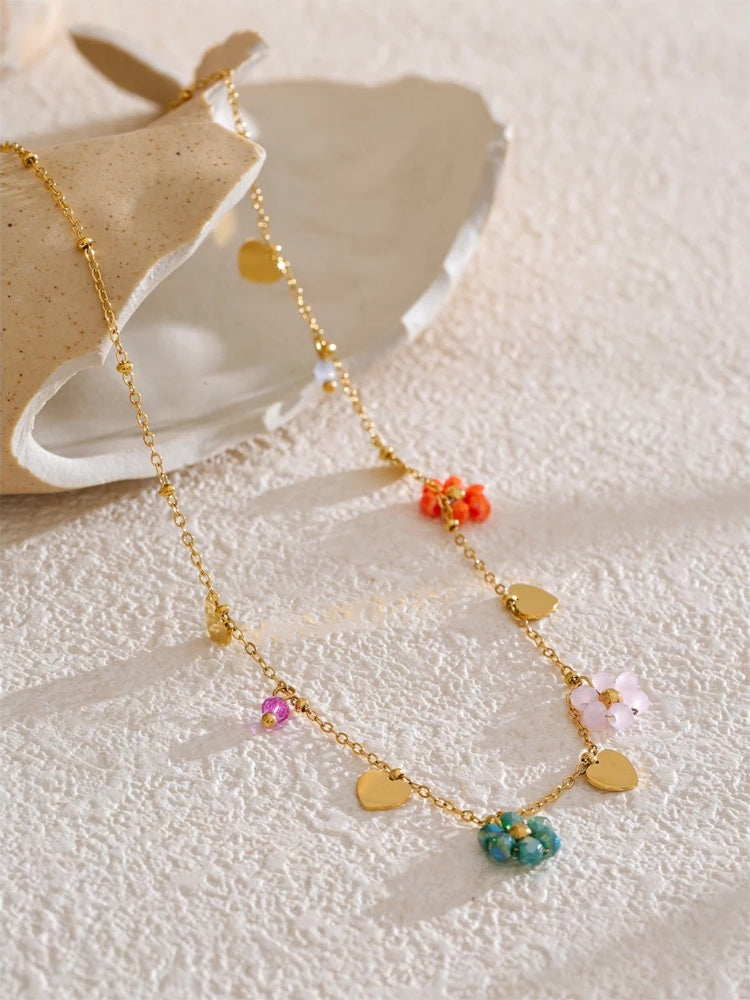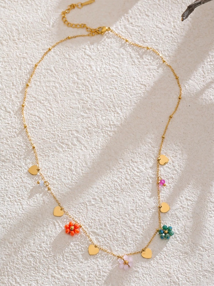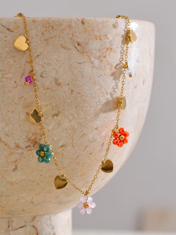 Delicate crystal flower pendants in vibrant colors are elegantly arranged along a gold-toned stainless steel chain, accented with small heart charms. The necklace features a durable PVD real gold plating that enhances its shine and provides resistance to water. Lightweight and trendy, it offers a charming, handmade look perfect for everyday wear or special occasions.