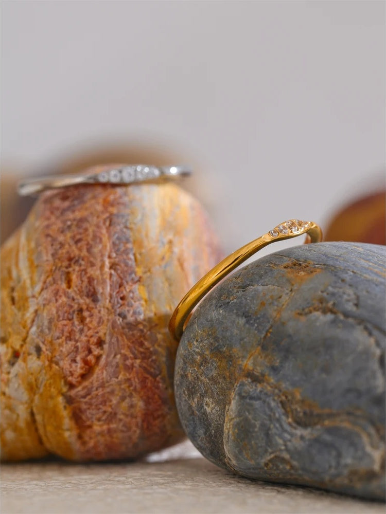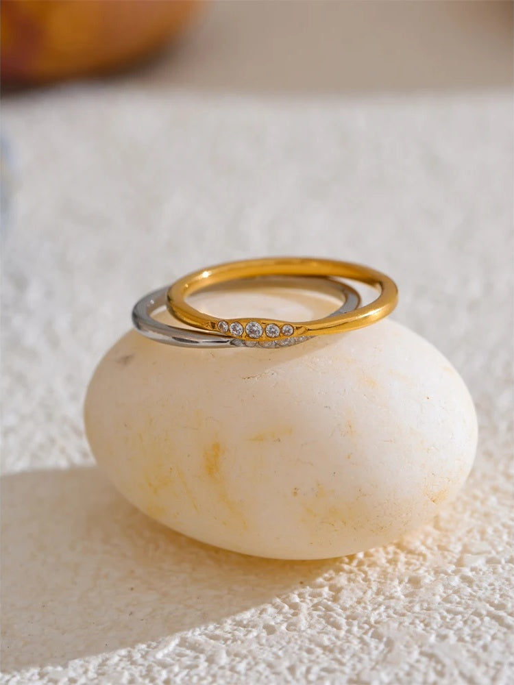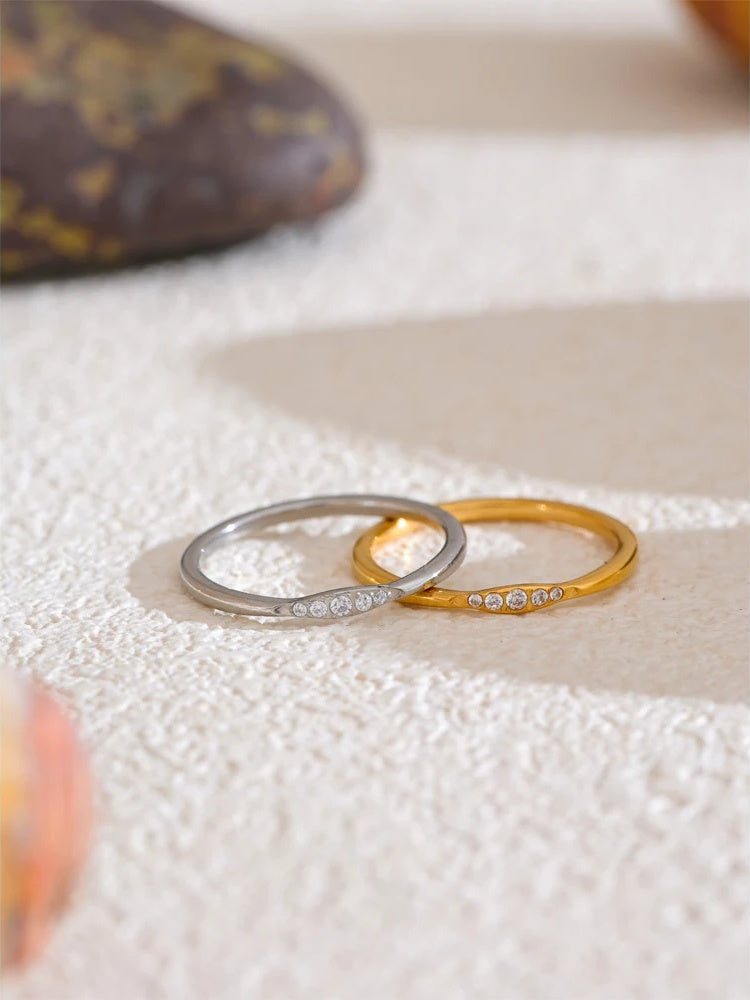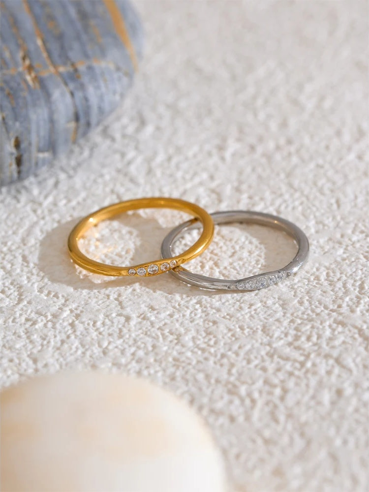 Featuring a minimalist geometric design, this thin casting ring is crafted from durable stainless steel with an 18k gold plating finish. Adorned with sparkling cubic zirconia stones, it offers a stylish and trendy look suited for any party or casual occasion. Available in both gold and steel color options, this versatile ring complements a range of outfits with subtle charm.
