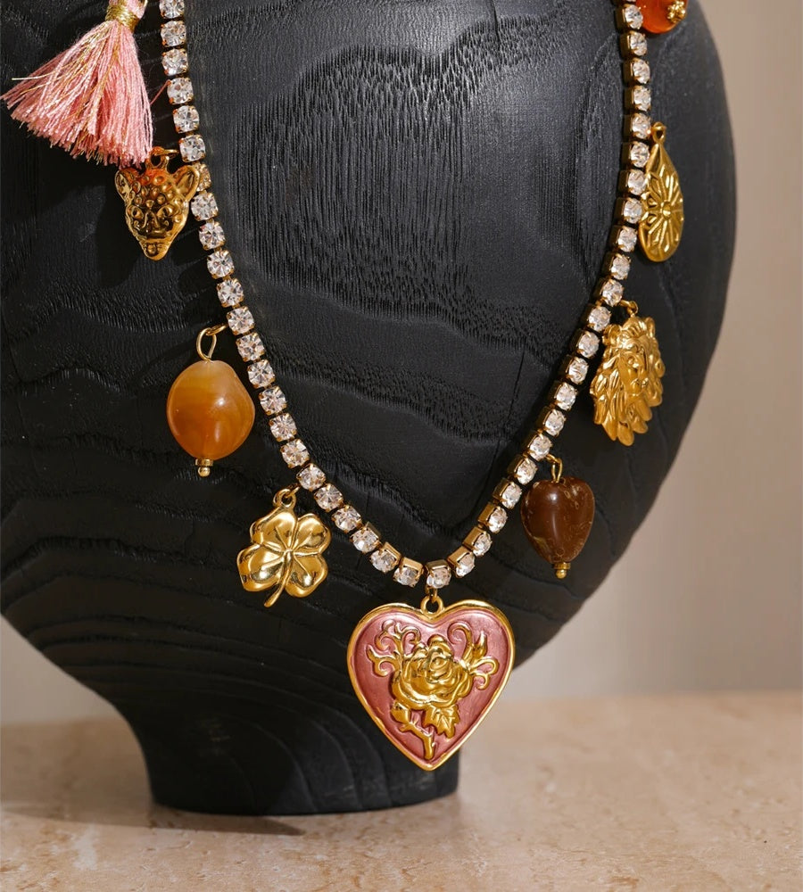 Featuring a sparkling cubic zirconia chain, this pendant necklace combines enamel and acrylic charms in heart and flower shapes for a unique and trendy look. Crafted from stainless steel with PVD real gold plating, it offers durability and a waterproof finish. The necklace showcases a mix of playful and elegant charms that add character to any outfit. Designed for women, it delivers fashion-forward style with fine attention to detail.