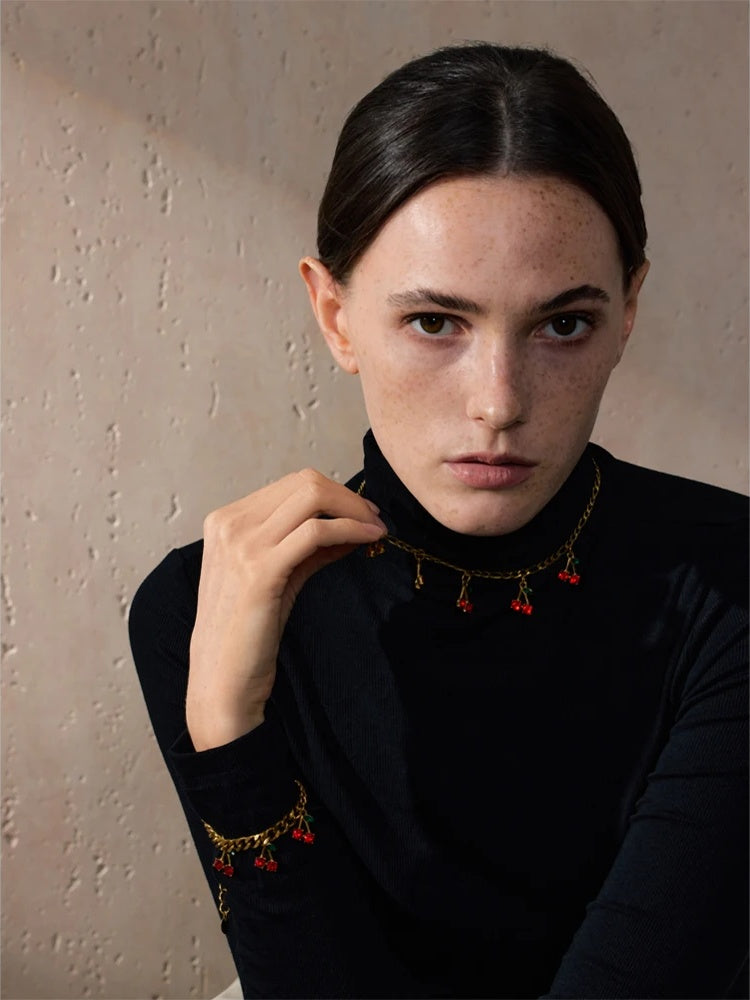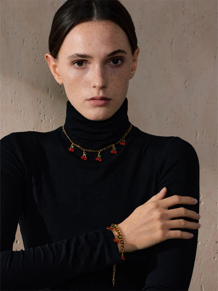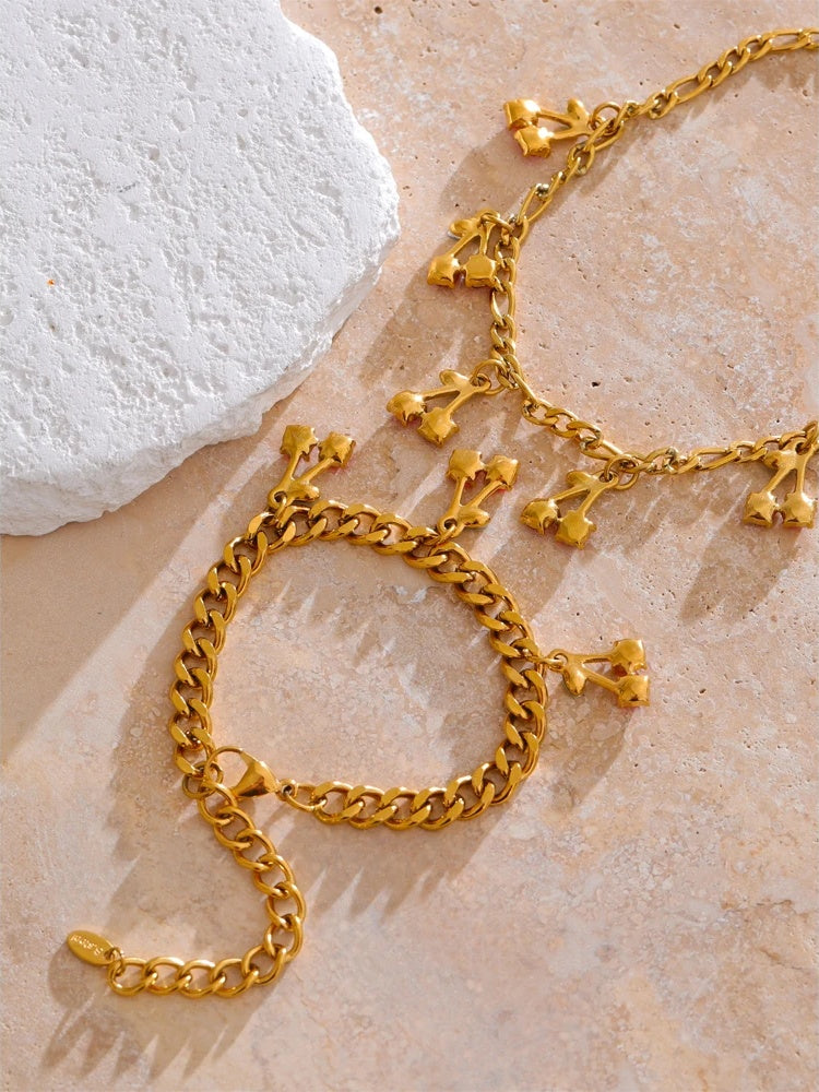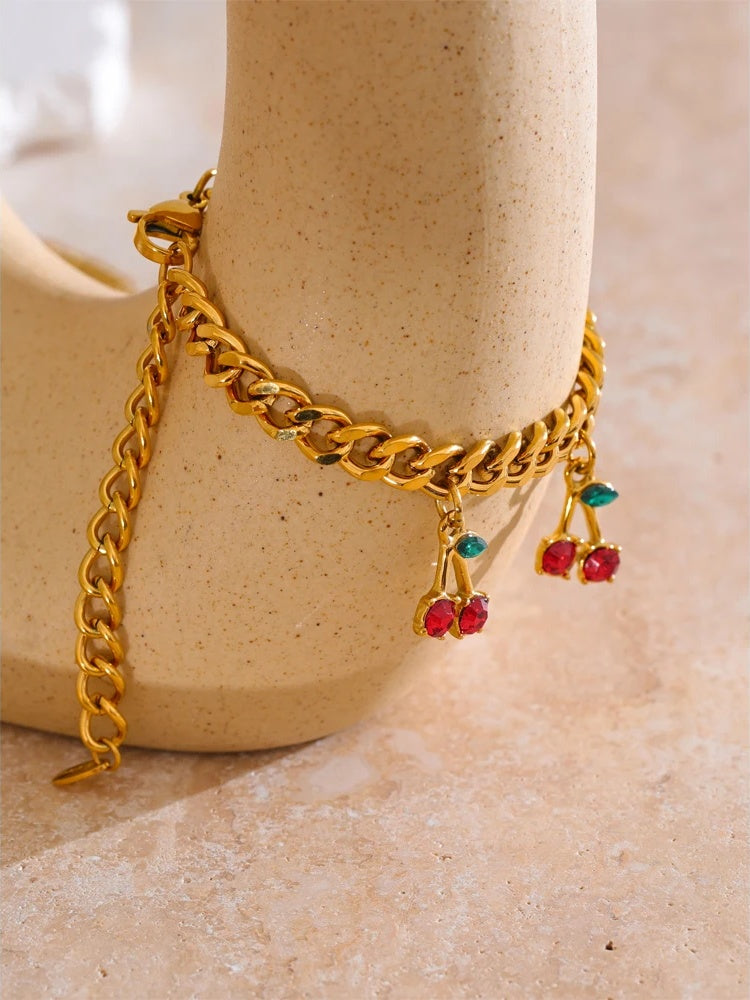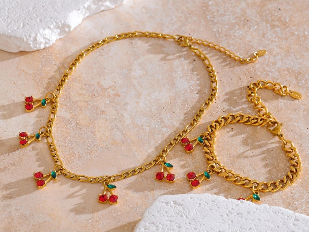 A charming jewelry set featuring a necklace and bracelet crafted from stainless steel with an 18K gold color plating. Each piece is adorned with vibrant cubic zirconia stones shaped like cherries, adding a playful yet elegant touch. The geometric design and glossy finish make it suitable for parties and trendy fashion looks. Lightweight and comfortable, this set complements a variety of outfits with a delicate sparkle.