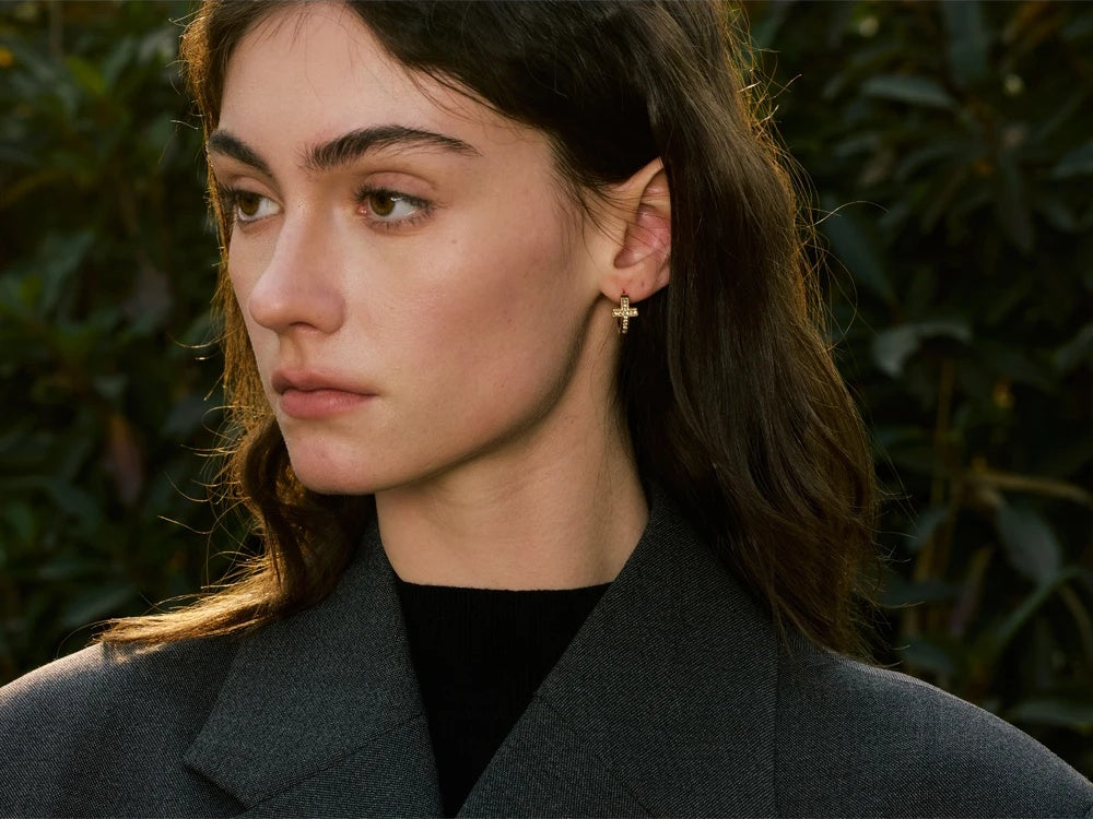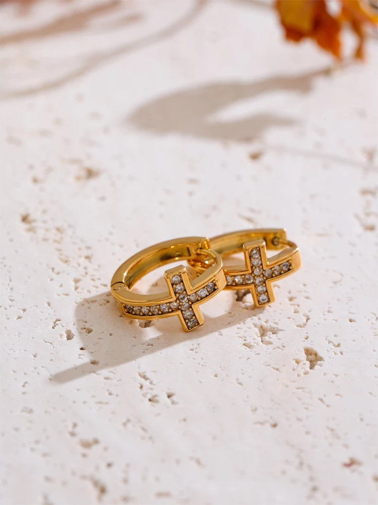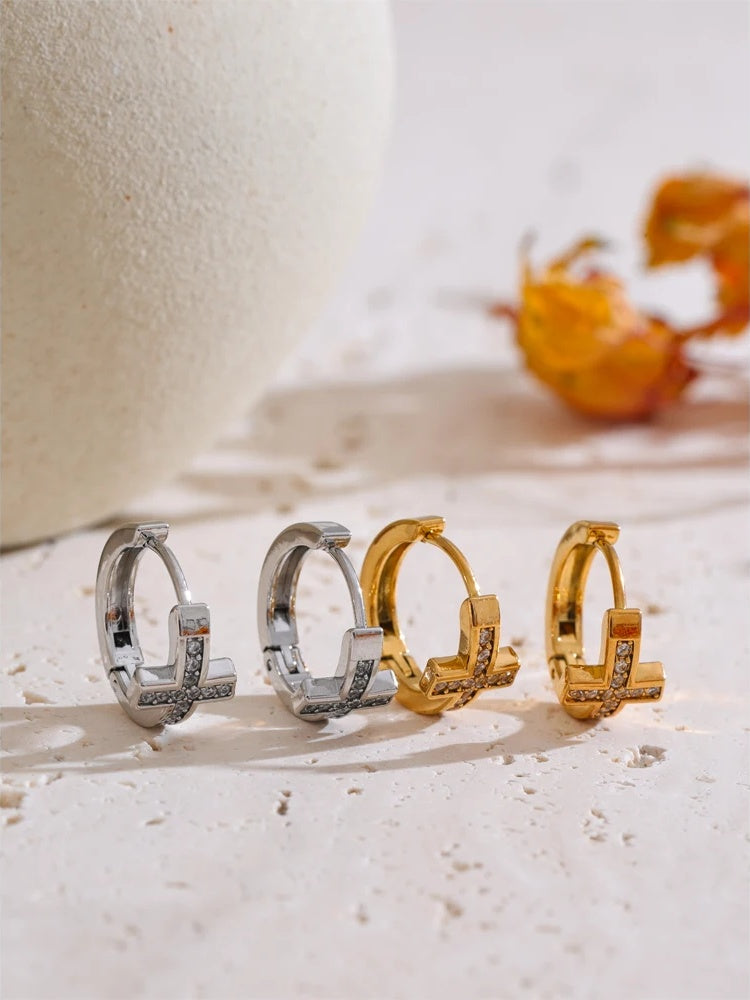 These hoop earrings feature a geometric cross design adorned with sparkling cubic zirconia stones for a refined look. Crafted from durable stainless steel with a PVD real gold plating, they offer both style and long-lasting wear. Lightweight and comfortable, they suit daily use and versatile fashion preferences. Available in gold and platinum tones to complement a variety of outfits and occasions.