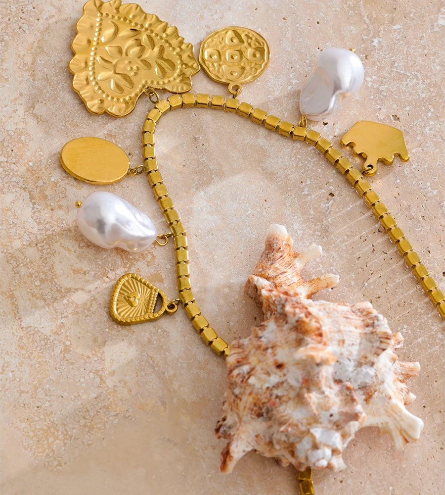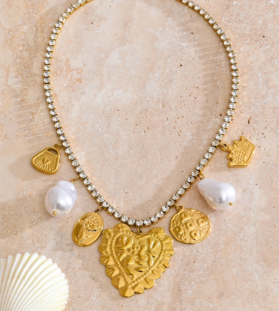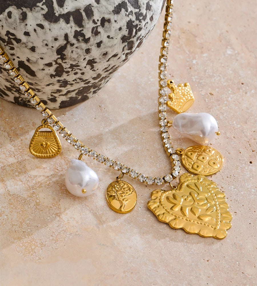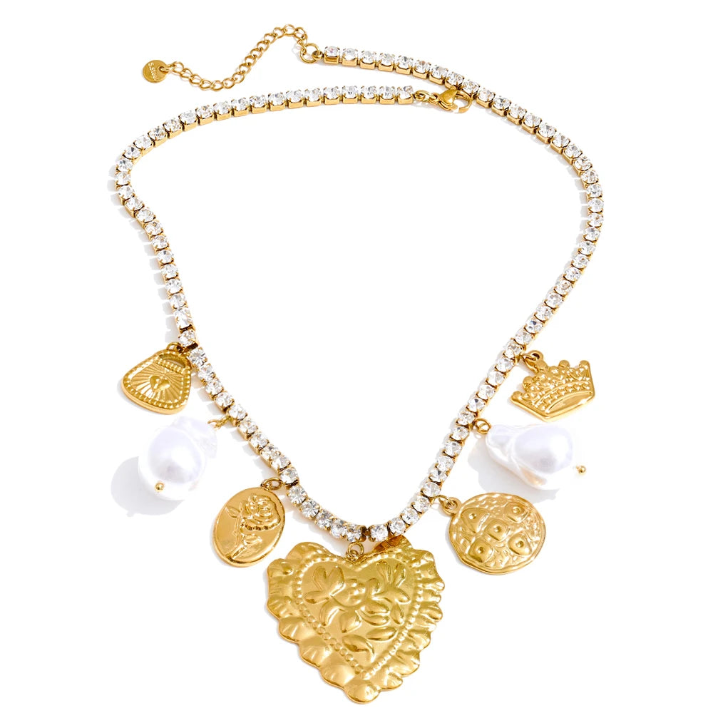 Featuring a sparkling chain adorned with a series of intricately designed gold-tone charms, this necklace combines elegance with a touch of whimsy. The centerpiece is a delicately embossed heart pendant, surrounded by floral motifs and accented with two lustrous pearl-like beads. Crafted from durable stainless steel and set with cubic zirconia, this piece offers lasting shine and fashion-forward appeal. Adjustable length ensures a comfortable fit for various styles and occasions.